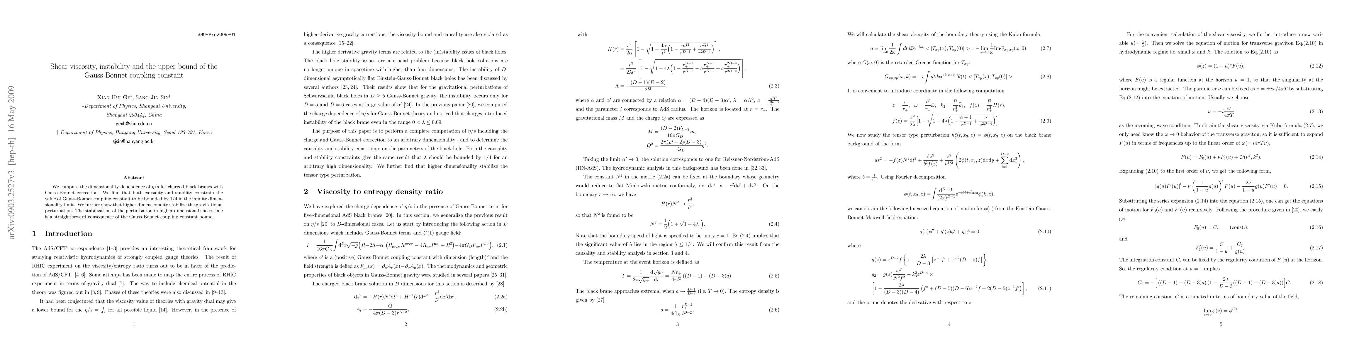 We compute the dimensionality dependence of $\eta/s$ for charged black branes with Gauss-Bonnet correction. We find that both causality and stability constrain the value of Gauss-Bonnet coupling constant to be bounded by 1/4 in the infinite dimensionality limit. We further show that higher dimensionality stabilize the gravitational perturbation. The stabilization of the perturbation in higher dimensional space-time is a straightforward consequence of the Gauss-Bonnet coupling constant bound.