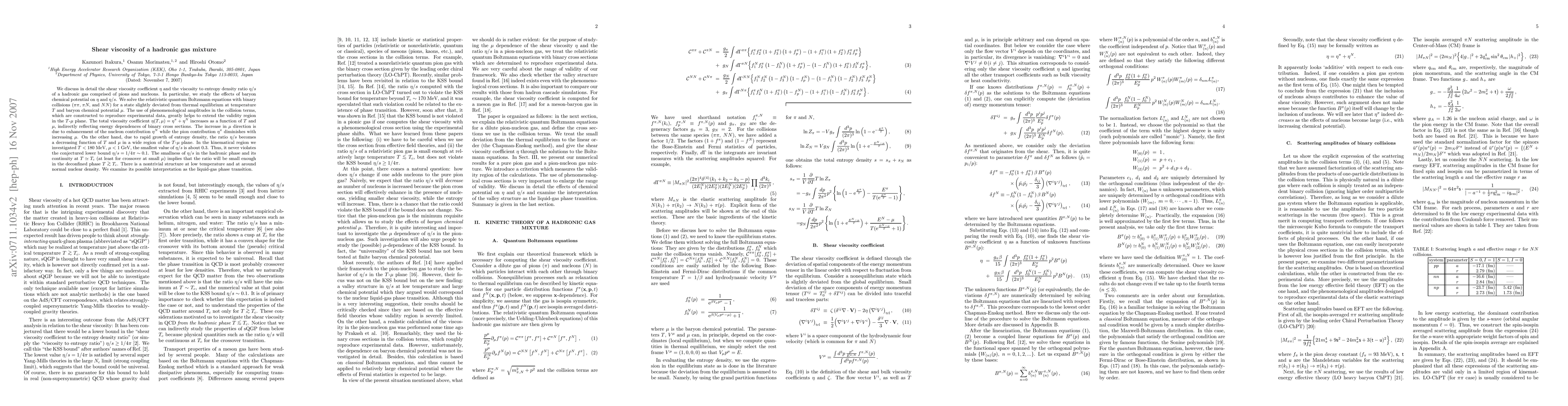 We discuss in detail the shear viscosity coefficient eta and the viscosity to entropy density ratio eta/s of a hadronic gas comprised of pions and nucleons. In particular, we study the effects of baryon chemical potential on eta and eta/s. We solve the relativistic quantum Boltzmann equations with binary collisions (pi pi, pi N, and NN) for a state slightly deviated from thermal equilibrium at temperature T and baryon chemical potential mu. The use of phenomenological amplitudes in the collision terms, which are constructed to reproduce experimental data, greatly helps to extend the validity region in the T-mu plane. The total viscosity coefficient eta(T,mu)=eta^pi + eta^N increases as a function of T and mu, indirectly reflecting energy dependences of binary cross sections. The increase in mu direction is due to enhancement of the nucleon contribution eta^N while the pion contribution eta^pi diminishes with increasing mu. On the other hand, due to rapid growth of entropy density, the ratio eta/s becomes a decreasing function of T and mu in a wide region of the T-mu plane. In the kinematical region we investigated T < 180MeV, mu < 1GeV, the smallest value of eta/s is about 0.3. Thus, it never violates the conjectured lower bound eta/s= 1/4pi ~ 0.1. The smallness of eta/s in the hadronic phase and its continuity at T ~ T_c (at least for crossover at small mu) implies that the ratio will be small enough in the deconfined phase T > T_c. There is a nontrivial structure at low temperature and at around normal nuclear density. We examine its possible interpretation as the liquid-gas phase transition.