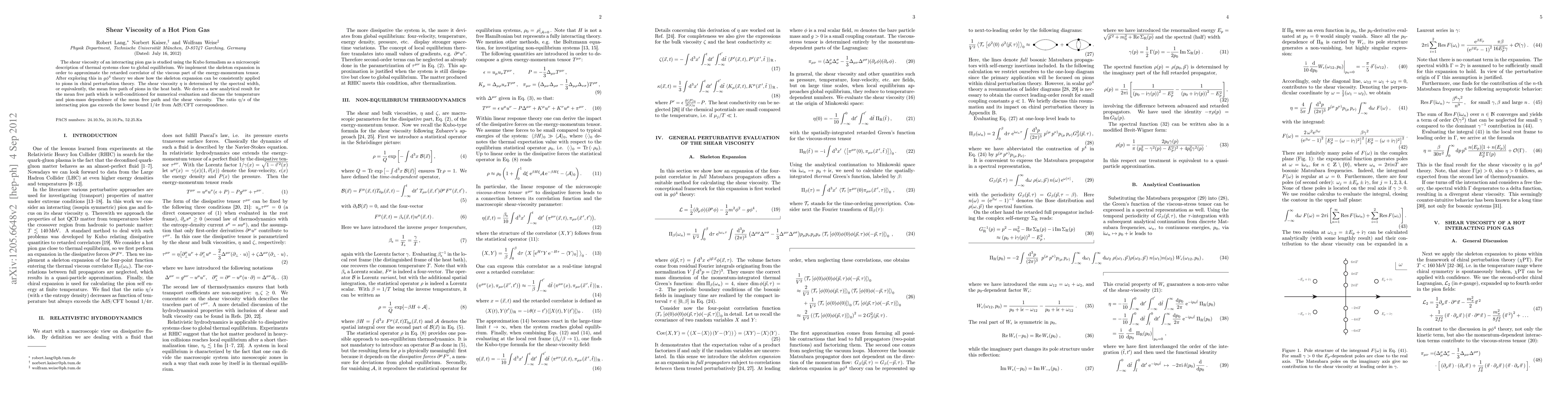 This paper investigates the shear viscosity of an interacting pion gas near global equilibrium using the Kubo formalism and skeleton expansion. It derives a new analytical expression for the mean free path of pions, showing that the ratio $\eta/s$ exceeds the lower bound predicted by AdS/CFT correspondence.