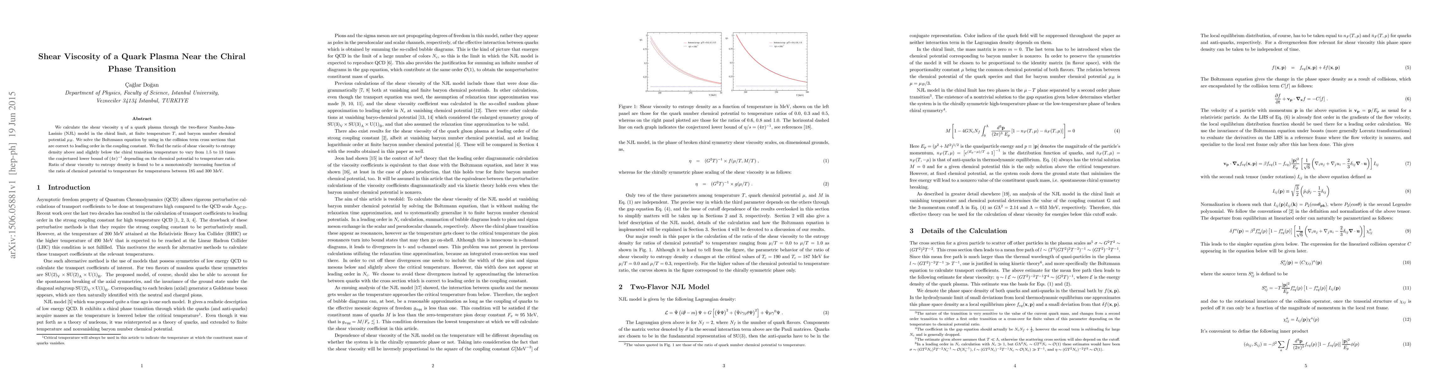 This paper calculates the shear viscosity $\eta$ of quark plasma near the chiral phase transition using the Nambu-Jona-Lasinio model, finding that the ratio of $\eta$ to entropy density varies from 1.5 to 13 times the conjectured lower bound $(4\pi)^{-1}$, depending on the chemical potential to temperature ratio, and increases monotonically with this ratio between 185 and 300 MeV.