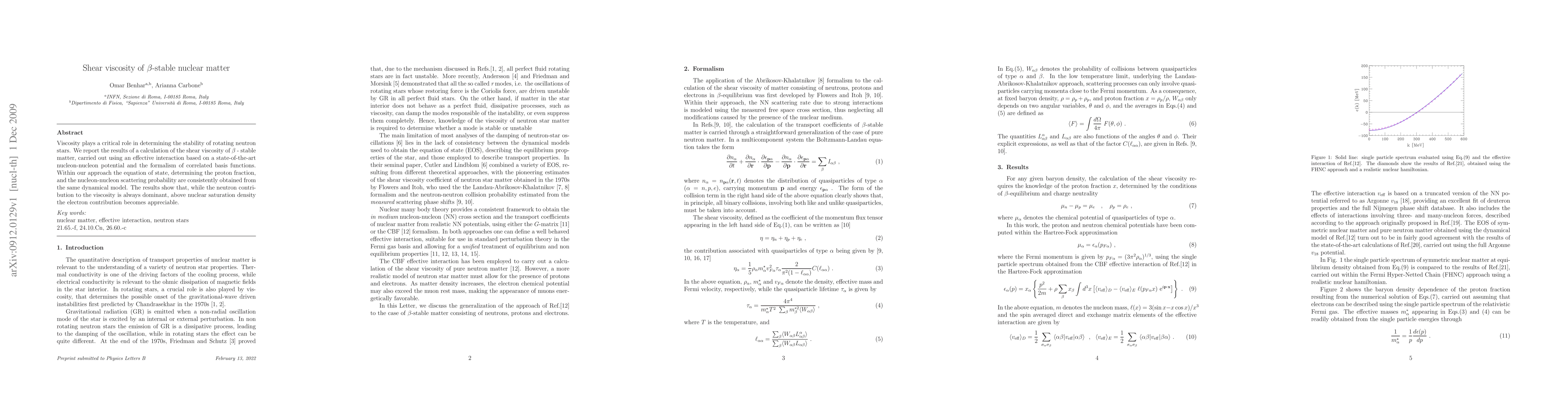 Viscosity plays a critical role in determining the stability of rotating neutron stars. We report the results of a calculation of the shear viscosity of $\beta$~-~stable matter, carried out using an effective interaction based on a state-of-the-art nucleon-nucleon potential and the formalism of correlated basis functions. Within our approach the equation of state, determining the proton fraction, and the nucleon-nucleon scattering probability are consistently obtained from the same dynamical model. The results show that, while the neutron contribution to the viscosity is always dominant, above nuclear saturation density the electron contribution becomes appreciable.