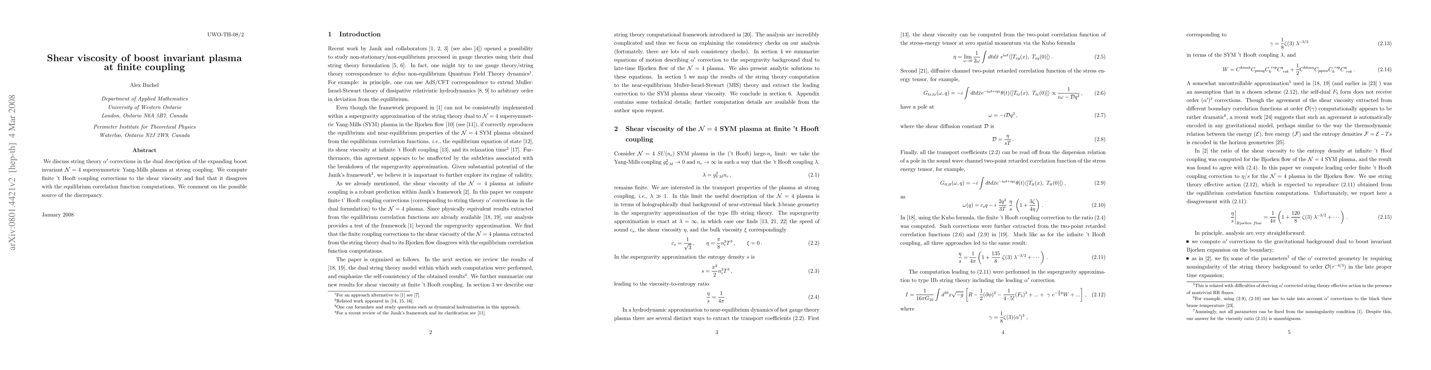 We discuss string theory alpha' corrections in the dual description of the expanding boost invariant N=4 supersymmetric Yang-Mills plasma at strong coupling. We compute finite 't Hooft coupling corrections to the shear viscosity and find that it disagrees with the equilibrium correlation function computations. We comment on the possible source of the discrepancy.