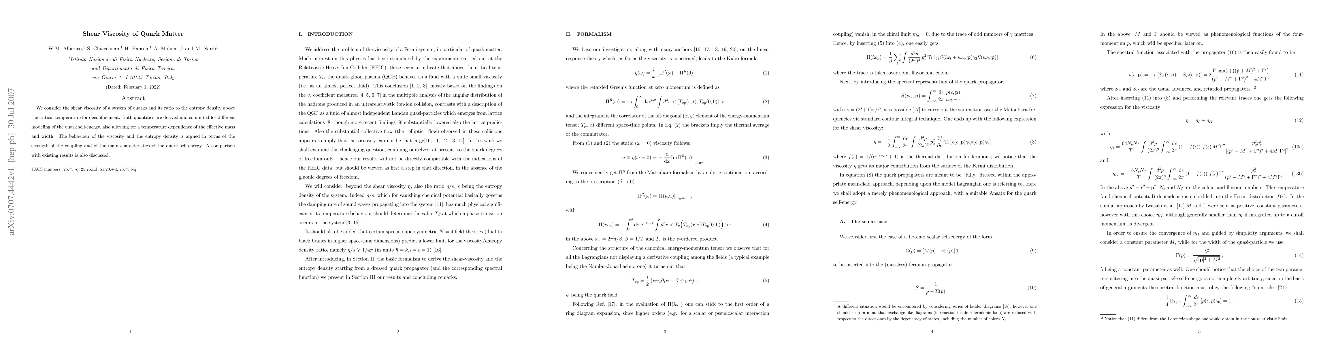 This paper investigates the shear viscosity of quark matter above the deconfinement temperature, computing its ratio to entropy density for various quark self-energy models. The findings are discussed in relation to the coupling strength and characteristics of the quark self-energy, with comparisons to prior research.