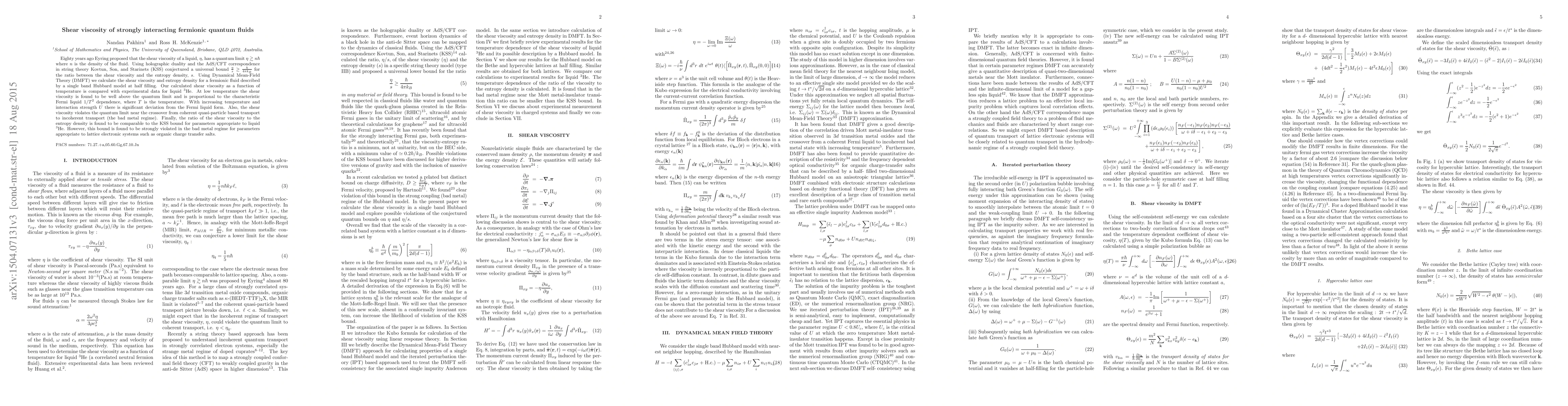 Eighty years ago Eyring proposed that the shear viscosity of a liquid, $\eta$, has a quantum limit $\eta \gtrsim n\hbar$ where $n$ is the density of the fluid. Using holographic duality and the AdS/CFT correspondence in string theory Kovtun, Son, and Starinets (KSS) conjectured a universal bound $\frac{\eta}{s}\geq \frac{\hbar}{4\pi k_{B}}$ for the ratio between the shear viscosity and the entropy density, $s$. Using Dynamical Mean-Field Theory (DMFT) we calculate the shear viscosity and entropy density for a fermionic fluid described by a single band Hubbard model at half filling. Our calculated shear viscosity as a function of temperature is compared with experimental data for liquid $^{3}$He. At low temperature the shear viscosity is found to be well above the quantum limit and is proportional to the characteristic Fermi liquid $1/T^{2}$ dependence, where $T$ is the temperature. With increasing temperature and interaction strength $U$ there is significant deviation from the Fermi liquid form. Also, the shear viscosity violates the quantum limit near the crossover from coherent quasi-particle based transport to incoherent transport (the bad metal regime). Finally, the ratio of the shear viscosity to the entropy density is found to be comparable to the KSS bound for parameters appropriate to liquid $^{3}$He. However, this bound is found to be strongly violated in the bad metal regime for parameters appropriate to lattice electronic systems such as organic charge transfer salts.