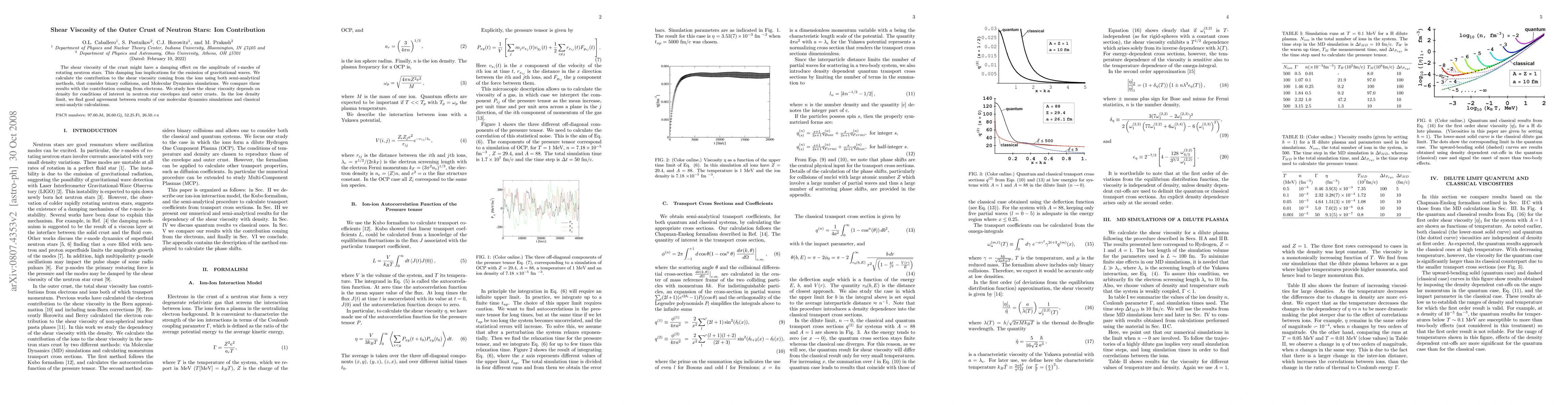 The shear viscosity of the crust might have a damping effect on the amplitude of r-modes of rotating neutron stars. This damping has implications for the emission of gravitational waves. We calculate the contribution to the shear viscosity coming from the ions using both semi-analytical methods, that consider binary collisions, and Molecular Dynamics simulations. We compare these results with the contribution coming from electrons. We study how the shear viscosity depends on density for conditions of interest in neutron star envelopes and outer crusts. In the low density limit, we find good agreement between results of our molecular dynamics simulations and classical semi-analytic calculations.