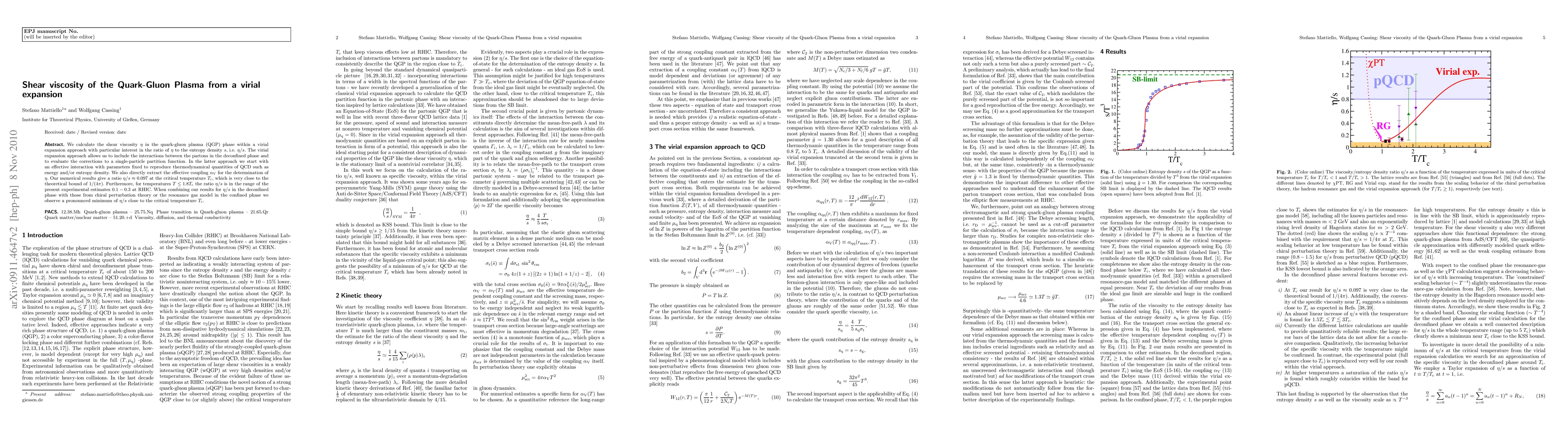We calculate the shear viscosity $\eta$ in the quark-gluon plasma (QGP) phase within a virial expansion approach with particular interest in the ratio of $\eta$ to the entropy density $s$, i.e. $\eta/s$. The virial expansion approach allows us to include the interactions between the partons in the deconfined phase and to evaluate the corrections to a single-particle partition function. In the latter approach we start with an effective interaction with parameters fixed to reproduce thermodynamical quantities of QCD such as energy and/or entropy density. We also directly extract the effective coupling $\ga_{\rm V}$ for the determination of $\eta$. Our numerical results give a ratio $\eta/s\approx 0.097$ at the critical temperature $T_{\rm c}$, which is very close to the theoretical bound of $1/(4\pi)$. Furthermore, for temperatures $T\leq 1.8 T_{\rm c}$ the ratio $\eta/s$ is in the range of the present experimental estimates $0.1-0.3$ at RHIC. When combining our results for $\eta/s$ in the deconfined phase with those from chiral perturbation theory or the resonance gas model in the confined phase we observe a pronounced minimum of $\eta/s$ close to the critical temperature $T_{\rm c}$.
