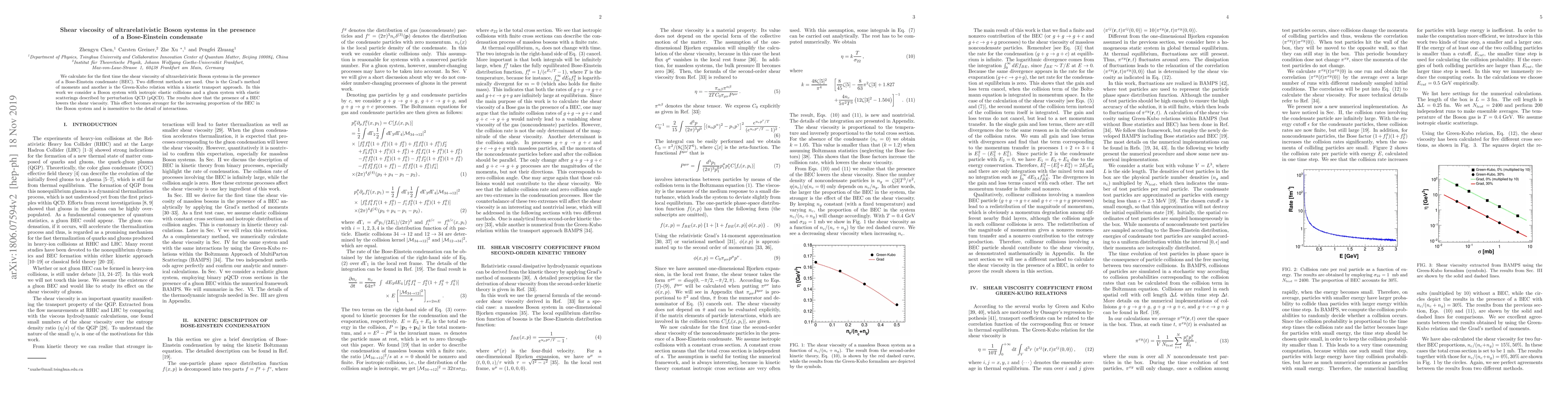 This paper calculates the shear viscosity of ultrarelativistic Boson systems with a Bose-Einstein condensate (BEC), employing Grad's method and the Green-Kubo relation. It finds that the presence of a BEC reduces shear viscosity, with the effect intensifying as the BEC proportion increases, regardless of interaction specifics.