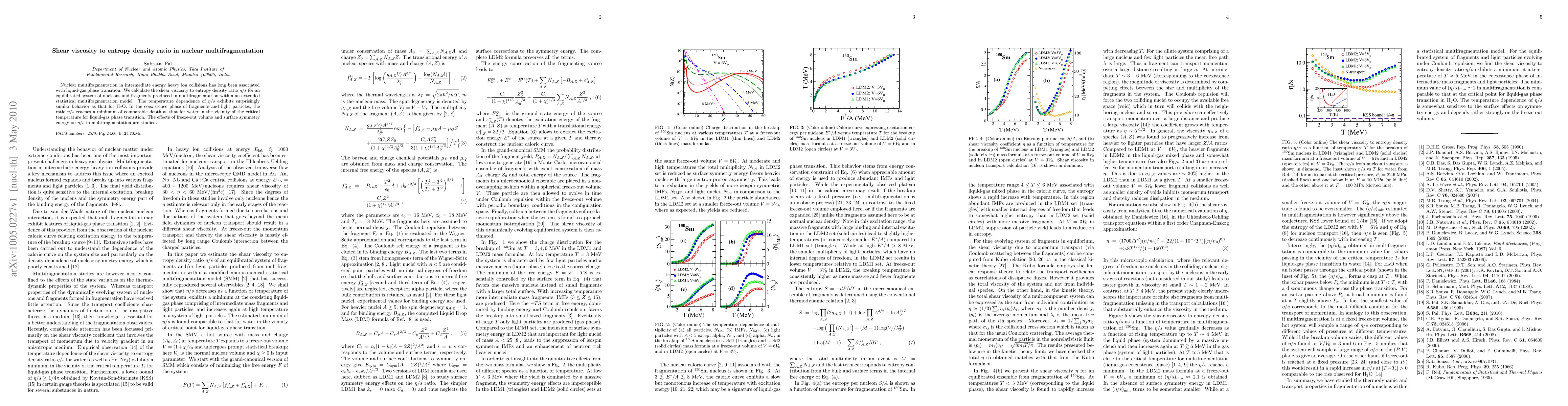 This paper calculates the shear viscosity to entropy density ratio (η/s) in nuclear multifragmentation, finding it exhibits similar temperature-dependent behavior to water, with a minimum near the critical temperature. The study also examines the effects of freeze-out volume and surface symmetry energy on η/s.