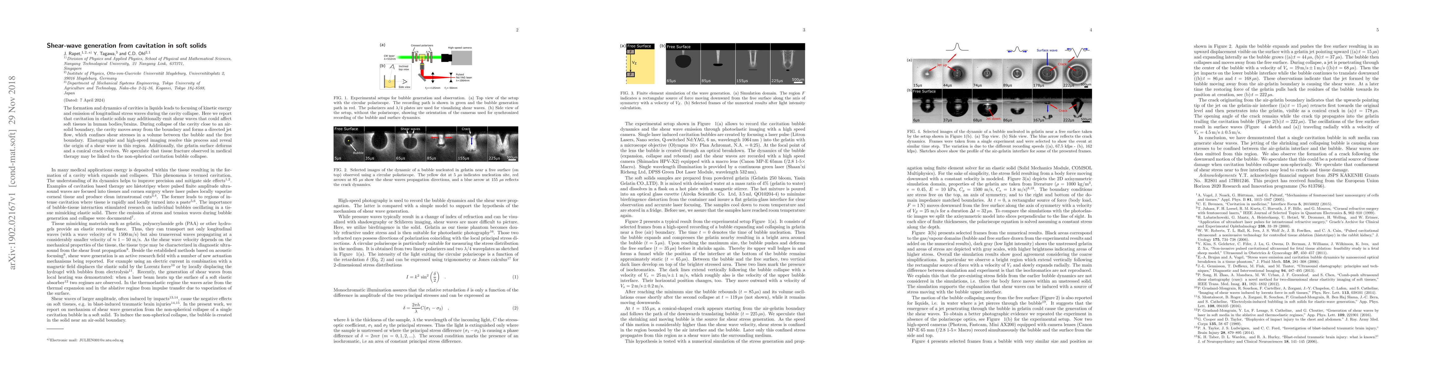 This paper investigates how cavitation in elastic solids generates shear waves during cavity collapse, particularly near air-solid boundaries. High-speed imaging and elastographic techniques reveal the formation of a directed jet flow and shear stresses in the region, potentially impacting soft tissues and suggesting a link to tissue fracture in medical therapy.