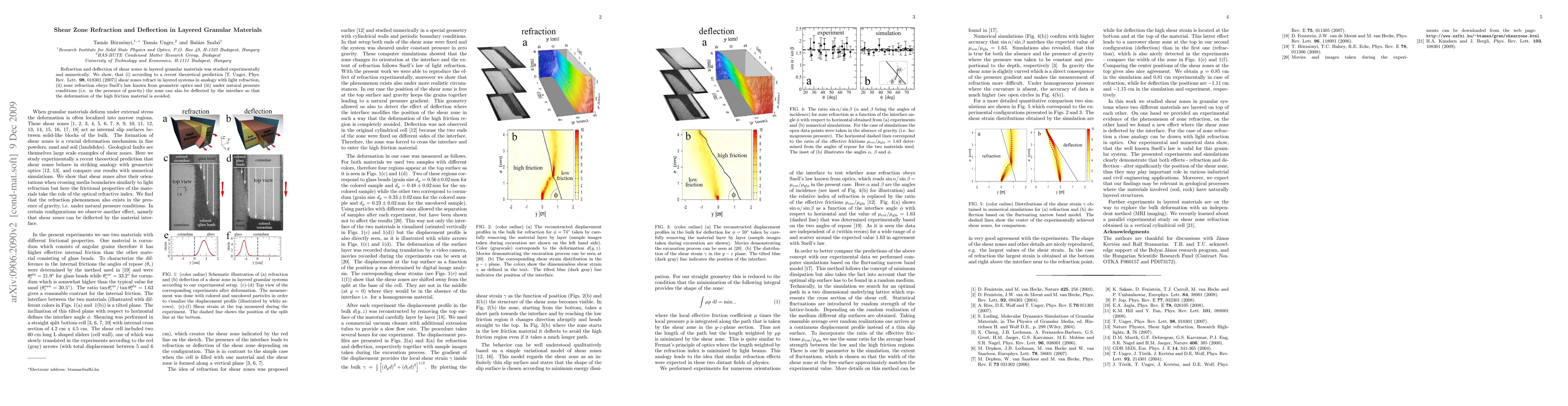 This study experimentally and numerically investigates shear zone behavior in layered granular materials, confirming that shear zones refract akin to light refraction, obeying Snell's law, and can be deflected by interfaces to avoid high friction material deformation under natural pressure conditions.