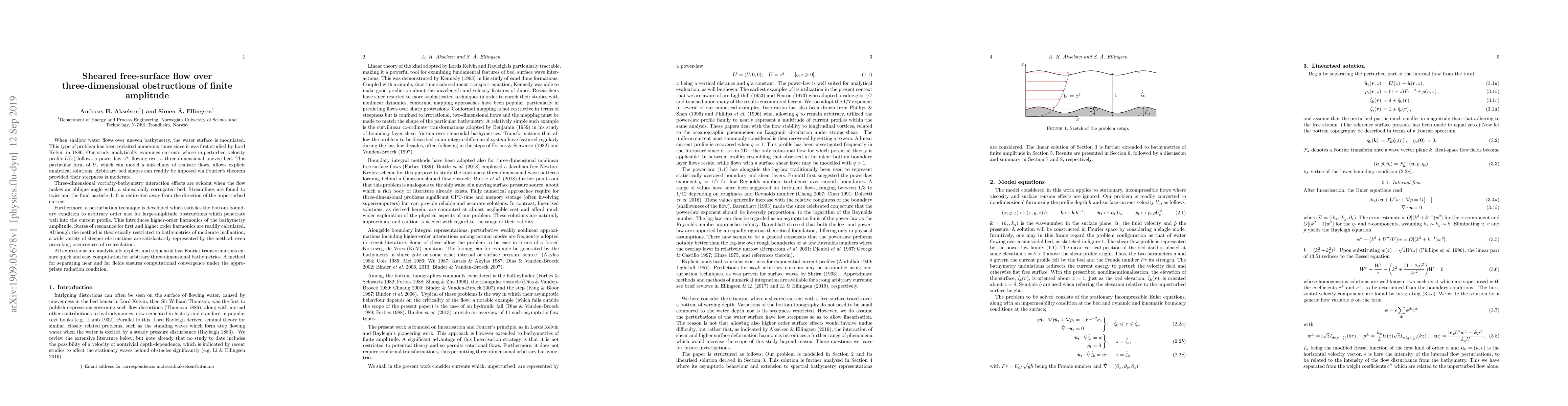 This paper analytically investigates sheared free-surface flow over three-dimensional obstructions, deriving explicit solutions for power-law velocity profiles. It develops a perturbation technique for large-amplitude obstructions, revealing vorticity-bathymetry interactions and higher-order harmonics, and ensuring computational efficiency via Fourier transformations.