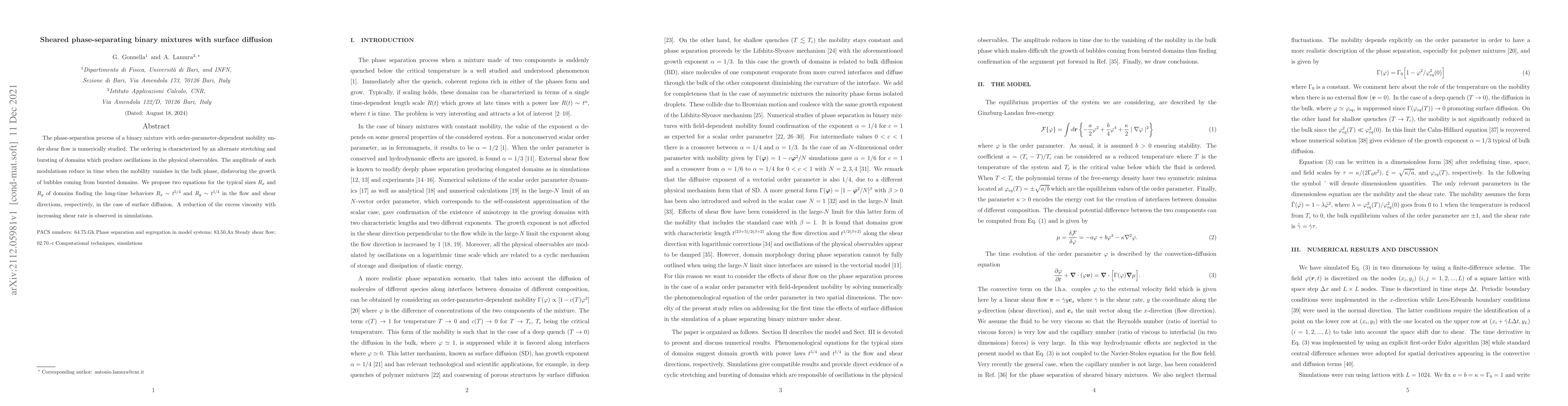 The phase-separation process of a binary mixture with order-parameter-dependent mobility under shear flow is numerically studied. The ordering is characterized by an alternate stretching and bursting of domains which produce oscillations in the physical observables. The amplitude of such modulations reduce in time when the mobility vanishes in the bulk phase, disfavoring the growth of bubbles coming from bursted domains. We propose two equations for the typical sizes $R_x$ and $R_y$ of domains finding the long-time behaviors $R_x \sim t^{5/4}$ and $R_y \sim t^{1/4}$ in the flow and shear directions, respectively, in the case of surface diffusion. A reduction of the excess viscosity with increasing shear rate is observed in simulations.