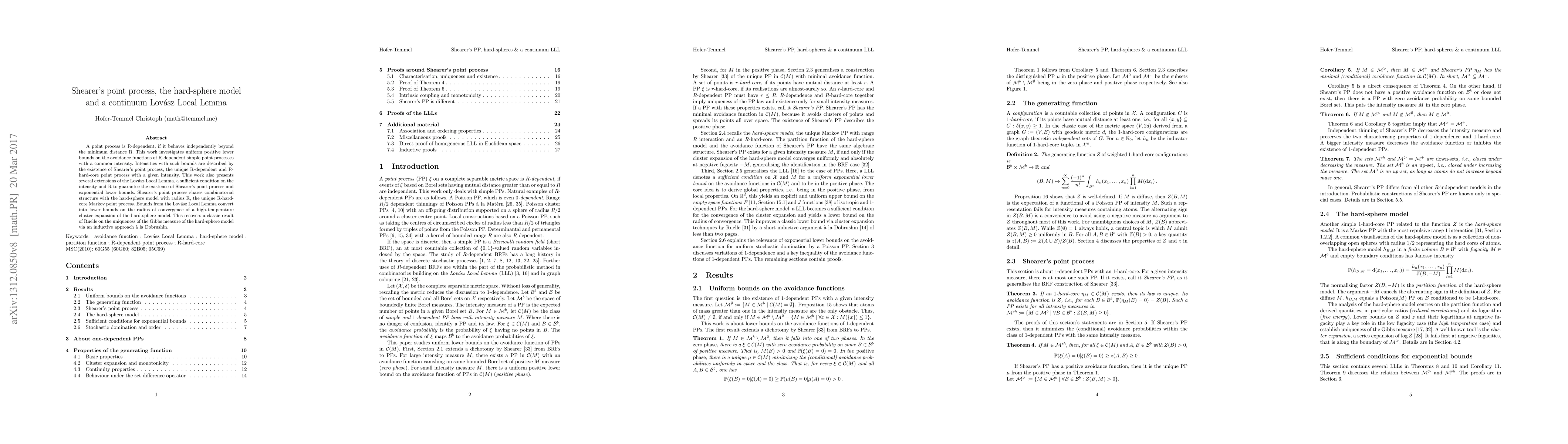 This paper explores uniform lower bounds on avoidance functions for R-dependent simple point processes, introducing Shearer's point process as a unique R-dependent and R-hard-core point process. It extends the Lovász Local Lemma to guarantee the existence of such processes and provides combinatorial insights linking them to the hard-sphere model, ultimately deriving lower bounds on the model's radius of convergence.