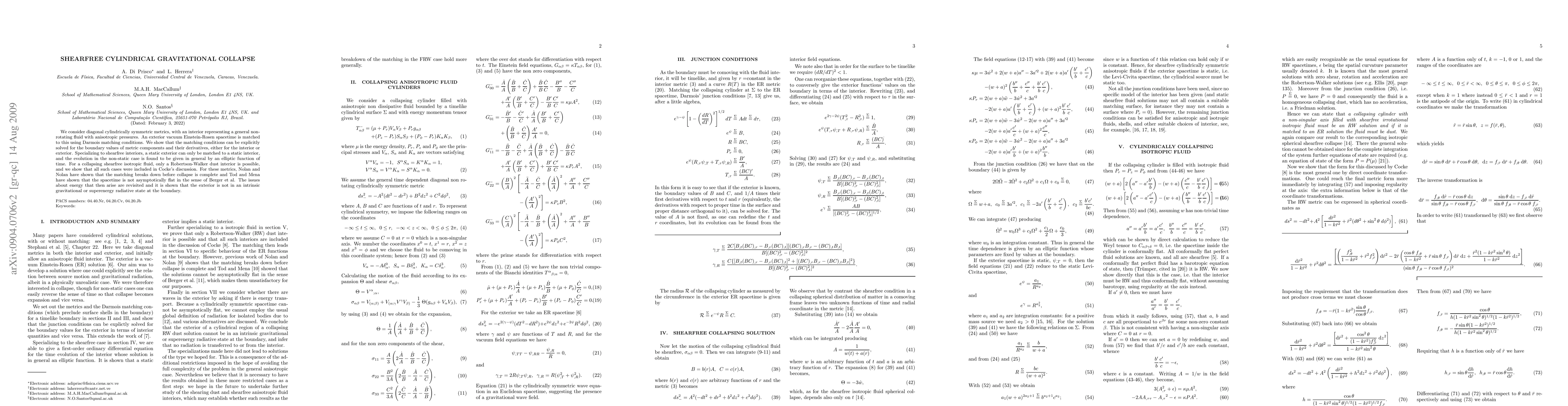 This paper explores the gravitational collapse of shearfree cylindrically symmetric metrics with anisotropic pressures, showing that matching conditions for interior fluid and exterior vacuum spacetime lead to specific evolution patterns and highlight issues with energy states and asymptotic flatness.