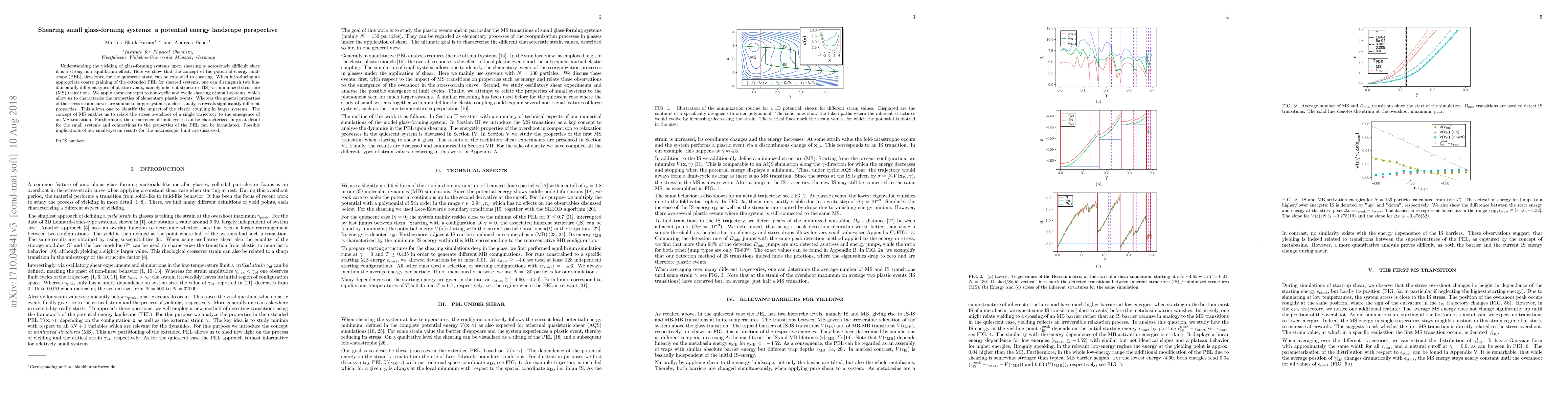Understanding the yielding of glass-forming systems upon shearing is notoriously difficult since it is a strong non-equilibrium effect. Here we show that the concept of the potential energy landscape (PEL), developed for the quiescent state, can be extended to shearing. When introducing an appropriate coarse graining of the extended PEL for sheared systems, one can distinguish two fundamentally different types of plastic events, namely inherent structures (IS) vs. minimized structure (MS) transitions. We apply these concepts to non-cyclic and cyclic shearing of small systems, which allow us to characterize the properties of elementary plastic events. Whereas the general properties of the stress-strain curves are similar to larger systems, a closer analysis reveals significantly different properties. This allows one to identify the impact of the elastic coupling in larger systems. The concept of MS enables us to relate the stress overshoot of a single trajectory to the emergence of an MS transition. Furthermore, the occurrence of limit cycles can be characterized in great detail for the small systems and connections to the properties of the PEL can be formulated. Possible implications of our small-system results for the macroscopic limit are discussed.