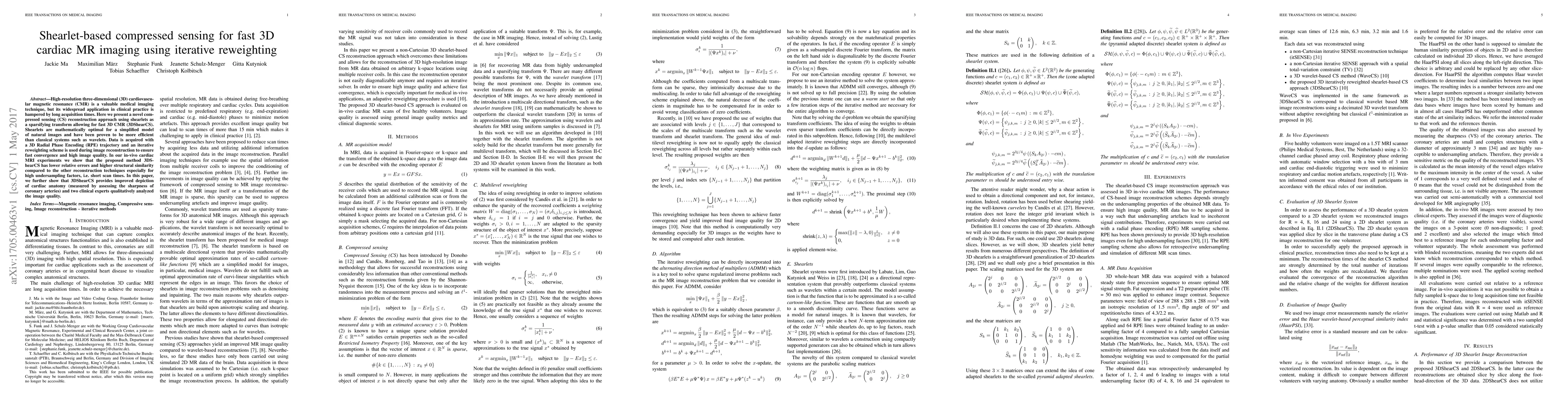 This paper introduces a shearlet-based compressed sensing method (3DShearCS) for fast 3D cardiac MRI, utilizing an iterative reweighting scheme for reconstruction. The method demonstrates lower relative errors and higher structural similarity, especially for high undersampling factors, providing improved depiction of cardiac anatomy compared to other techniques.
