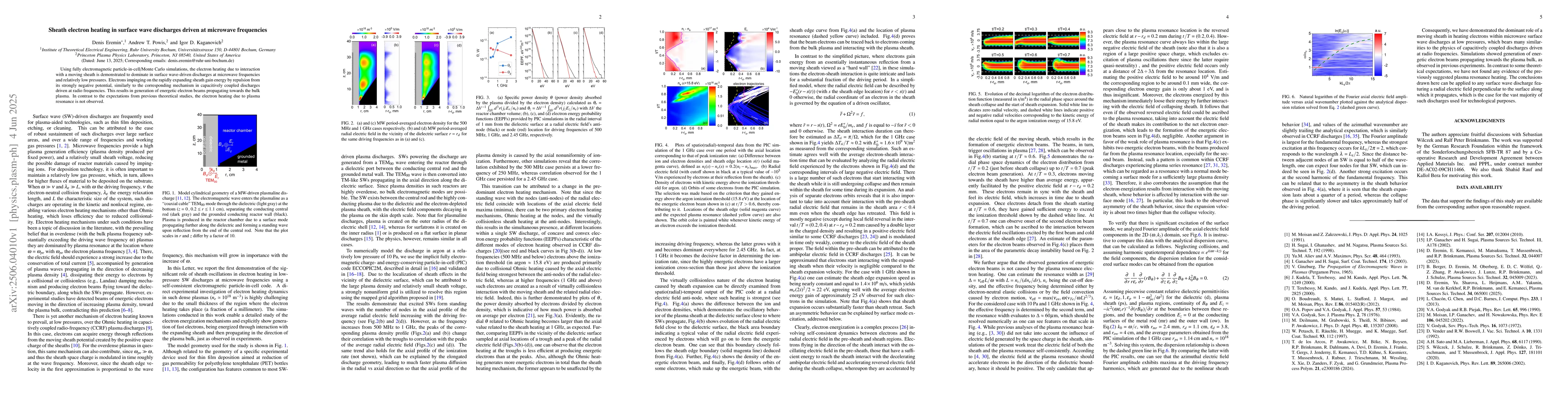 The paper presents a comprehensive analysis of electron heating mechanisms in surface wave discharges using advanced particle-in-cell/Monte Carlo simulations, revealing the dominance of sheath electron heating over plasma resonance at microwave frequencies and low pressures.