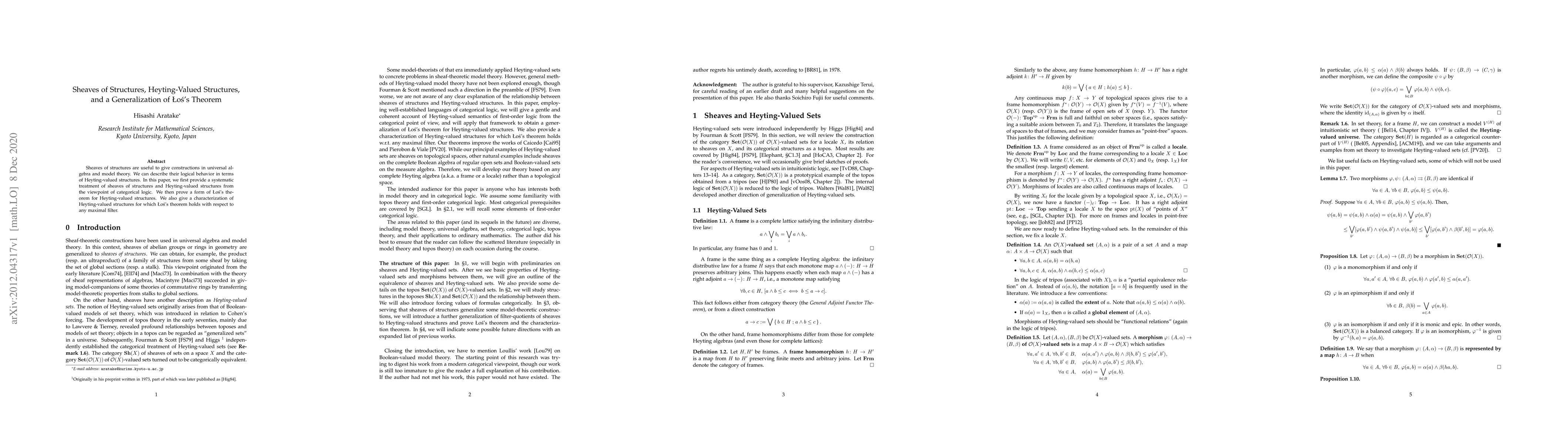 This paper systematically explores sheaves of structures and Heyting-valued structures within categorical logic, proving a generalized version of {\L}o\'s's theorem for Heyting-valued structures and characterizing those for which the theorem holds with respect to any maximal filter.