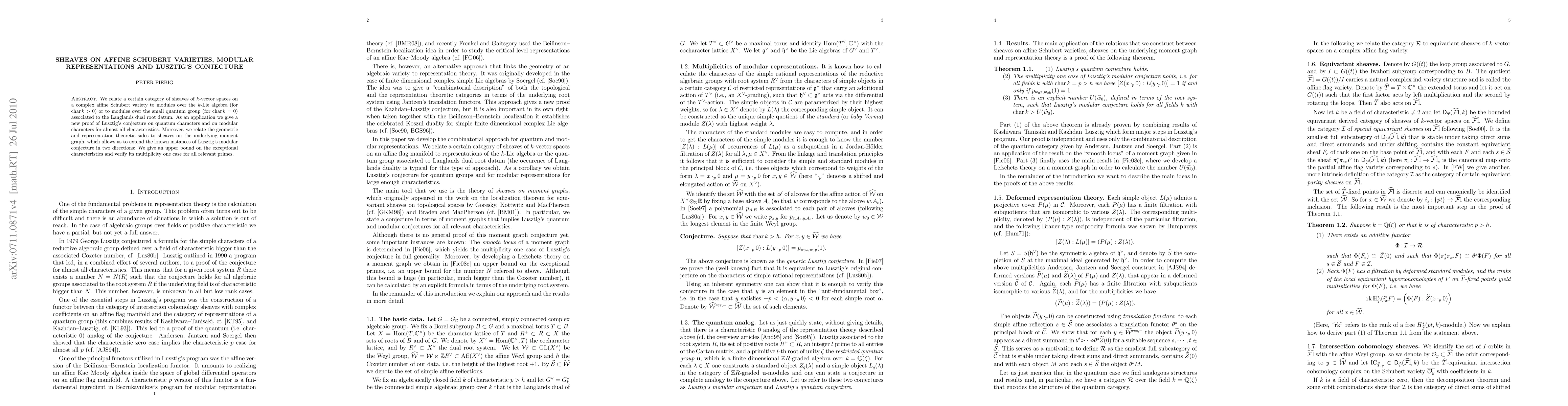 This paper connects sheaves on affine Schubert varieties to modules over Lie algebras and quantum groups, providing a new proof of Lusztig's conjecture on quantum and modular characters. It also extends the conjecture by establishing an upper bound on exceptional characteristics and verifying the multiplicity one case for relevant primes.