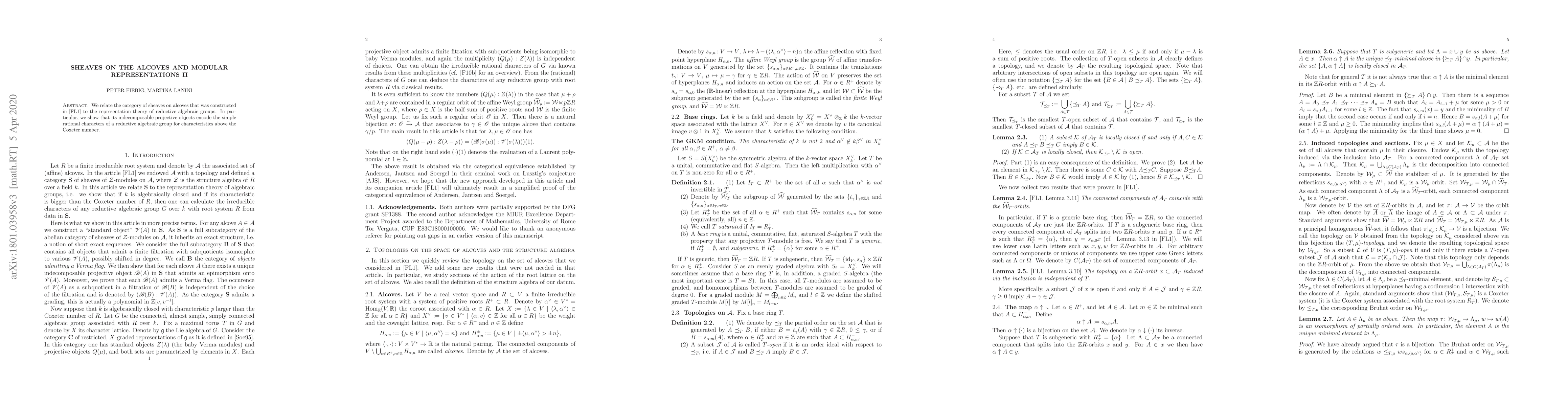 This paper connects the category of sheaves on alcoves from a previous study to the representation theory of reductive algebraic groups, demonstrating that indecomposable projective objects in this category correspond to simple rational characters in characteristics greater than the Coxeter number.