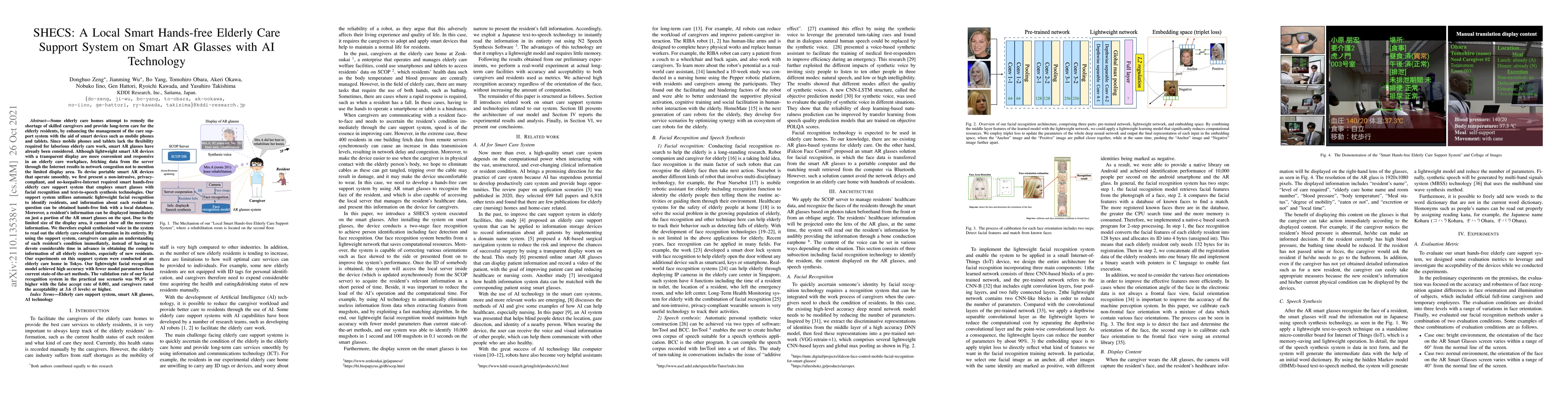 The SHECS system employs smart AR glasses with AI-driven facial recognition and text-to-speech to provide a local, hands-free elderly care support system, minimizing network congestion and enhancing caregiver efficiency. The system achieves high facial recognition accuracy and is highly rated for its usability.