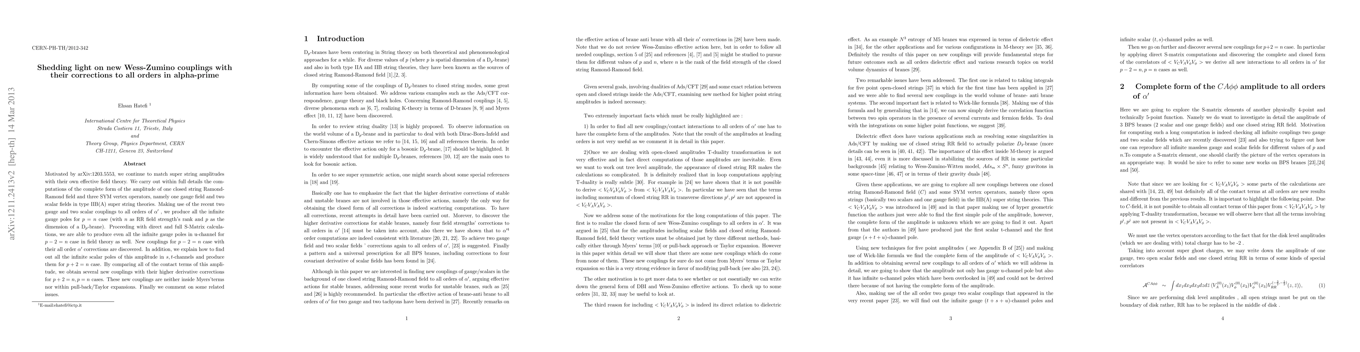 Motivated by arXiv:1203.5553, we continue to match super string amplitudes with their own effective field theory. We carry out within full details the computations of the complete form of the amplitude of one closed string Ramond-Ramond field and three SYM vertex operators, namely one gauge field and two scalar fields in type IIB(A) super string theories. Making use of the recent two gauge and two scalar couplings to all orders of $\alpha'$, we produce all the infinite gauge poles for $p=n$ case (with $n$ as RR field strength's rank and $p$ as the dimension of a D$_p$-brane). Proceeding with direct and full S-Matrix calculations, we are able to produce even all the infinite gauge poles in u-channel for $p-2=n$ case in field theory as well. New couplings for $p-2=n$ case with their all order $\alpha'$ corrections are discovered. In addition, we explain how to find out all the infinite scalar poles of this amplitude in $s,t$-channels and produce them for $p+2=n$ case. By comparing all of the contact terms of this amplitude, we obtain several new couplings with their higher derivative corrections for $p+2=n,p=n$ cases. These new couplings are neither inside Myers'terms nor within pull-back/Taylor expansions. Finally we comment on some related issues.