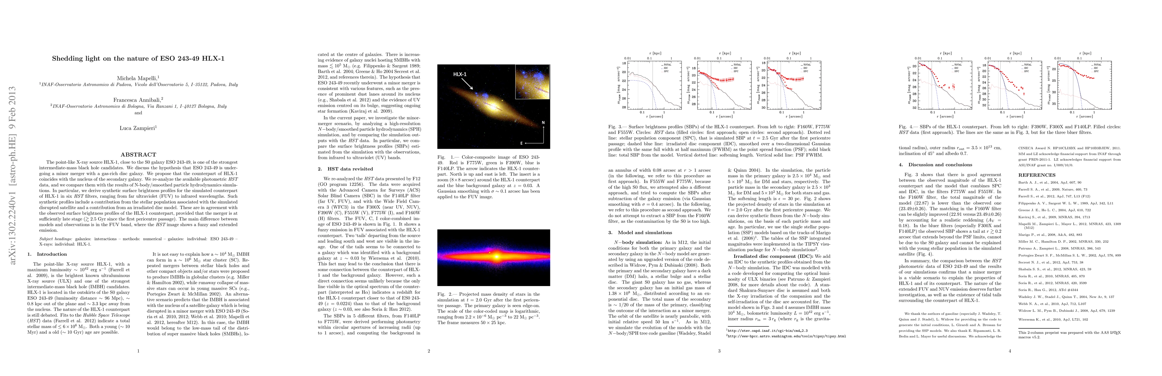The point-like X-ray source HLX-1, close to the S0 galaxy ESO 243-49, is one of the strongest intermediate-mass black hole candidates. We discuss the hypothesis that ESO 243-49 is undergoing a minor merger with a gas-rich disc galaxy. We propose that the counterpart of HLX-1 coincides with the nucleus of the secondary galaxy. We re-analyze the available photometric HST data, and we compare them with the results of N-body/smoothed particle hydrodynamics simulations. In particular, we derive synthetic surface brightness profiles for the simulated counterpart of HLX-1 in six HST filters, ranging from far ultraviolet (FUV) to infrared wavelengths. Such synthetic profiles include a contribution from the stellar population associated with the simulated disrupted satellite and a contribution from an irradiated disc model. These are in agreement with the observed surface brightness profiles of the HLX-1 counterpart, provided that the merger is at sufficiently late stage (>~2.5 Gyr since the first pericentre passage). The main difference between models and observations is in the FUV band, where the HST image shows a fuzzy and extended emission.