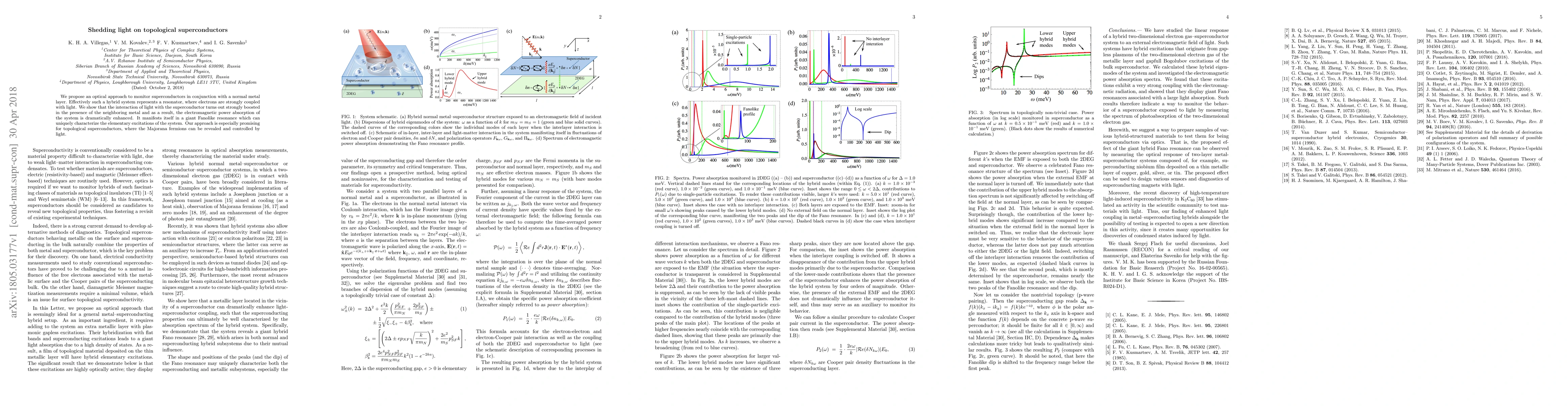 We propose an optical approach to monitor superconductors in conjunction with a normal metal layer. Effectively such a hybrid system represents a resonator, where electrons are strongly coupled with light. We show that the interaction of light with the superconductor turns out strongly boosted in the presence of the neighboring metal and as a result, the electromagnetic power absorption of the system is dramatically enhanced. It manifests itself in a giant Fanolike resonance which can uniquely characterize the elementary excitations of the system. Our approach is especially promising for topological superconductors, where the Majorana fermions can be revealed and controlled by light.