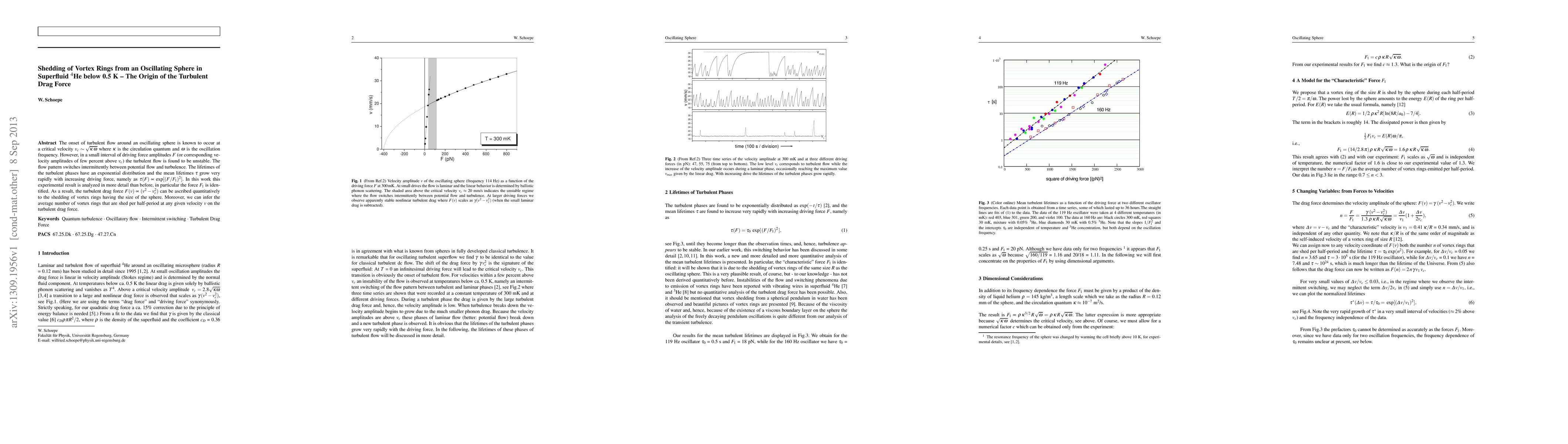 The onset of turbulent flow around an oscillating sphere is known to occur at a critical velocity vc ~ sqrt(kappa omega) where kappa is the circulation quantum and omega is the oscillation frequency. However, in a small interval of driving force amplitudes F (or corresponding velocity amplitudes of few percent above vc) the turbulent flow is found to be unstable. The flow pattern switches intermittently between potential flow and turbulence. The lifetimes of the turbulent phases have an exponential distribution and the mean lifetimes tau grow very rapidly with increasing driving force, namely as tau(F) ~ exp [(F/F1)^2]. In this work this experimental result is analyzed in more detail than before, in particular the force F1 is identified. As a result, the turbulent drag force F(v) ~ (v^2 - vc^2) can be ascribed quantitatively to the shedding of vortex rings having the size of the sphere. Moreover, we can infer the average number of vortex rings that are shed per half-period at any given velocity v on the turbulent drag force.