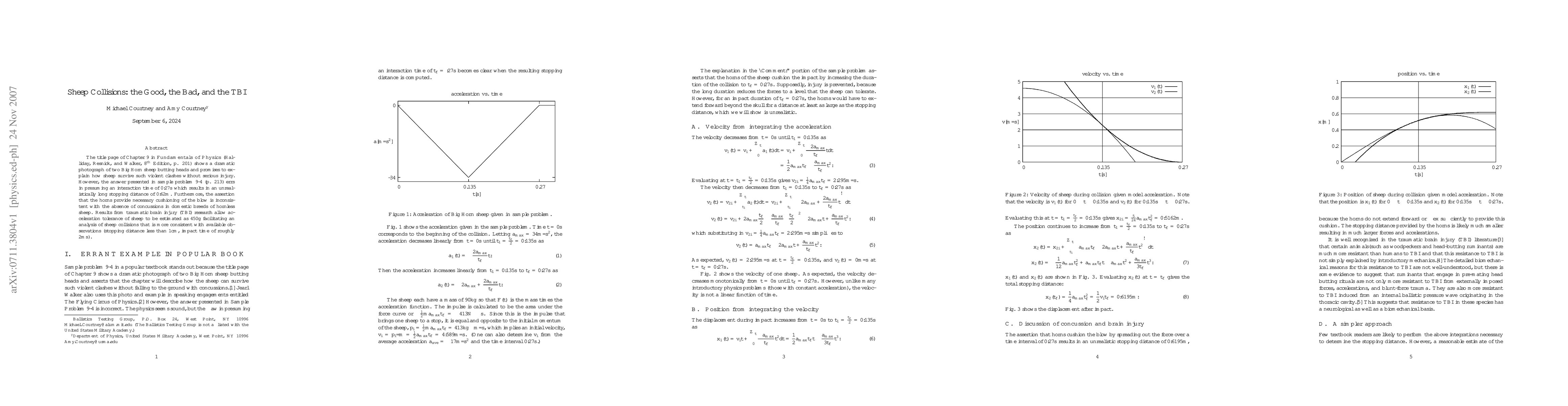 This paper critiques a physics textbook's explanation of sheep head-butting, noting its erroneous assumption of interaction time and stopping distance. It argues that the textbook's claim of horn cushioning is flawed, supported by TBI research indicating a much shorter impact time and smaller stopping distance in actual collisions.