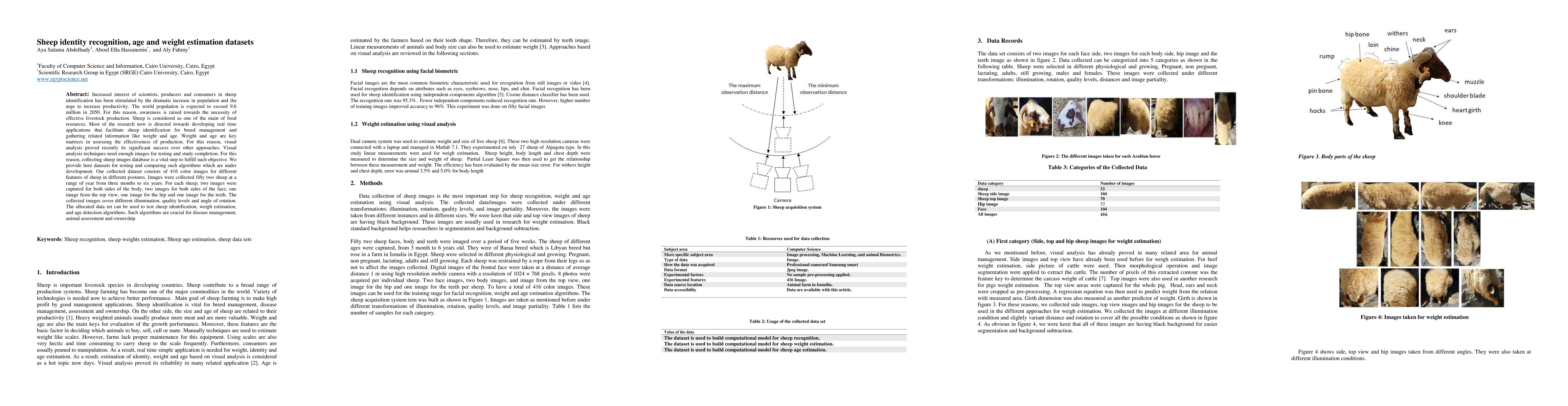 This study provides a dataset of 416 images of sheep in various postures for testing and comparing visual analysis algorithms for identification, weight estimation, and age detection.