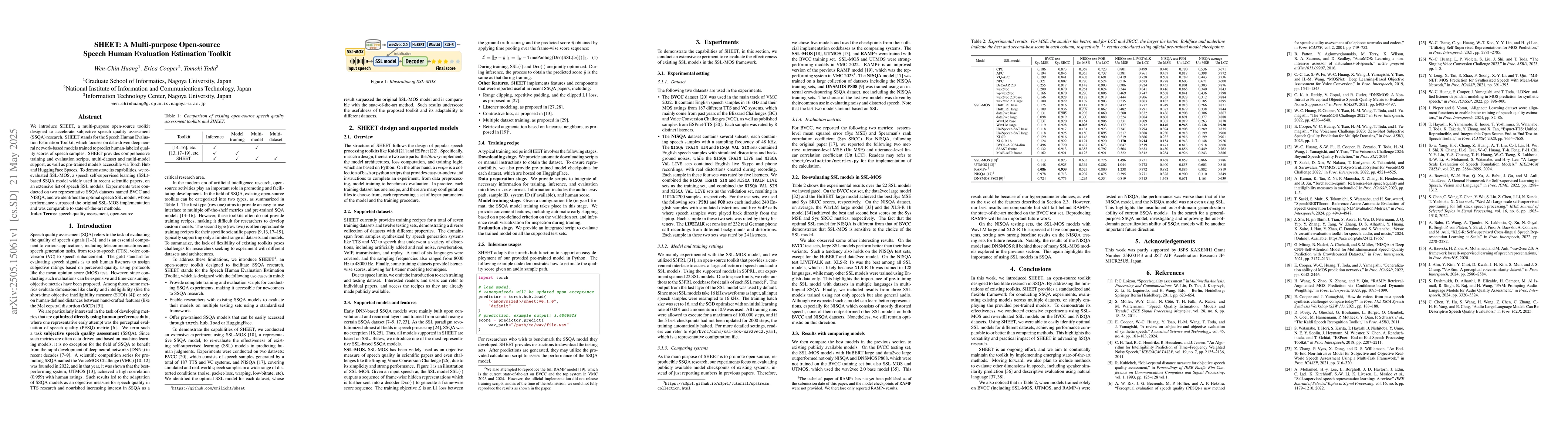 The research introduces SHEET, a multi-purpose open-source toolkit for accelerating subjective speech quality assessment (SSQA) research using deep neural network-based models trained on human-labeled speech quality scores. It offers training and evaluation scripts, multi-dataset and multi-model support, and pre-trained models via Torch Hub and HuggingFace Spaces.