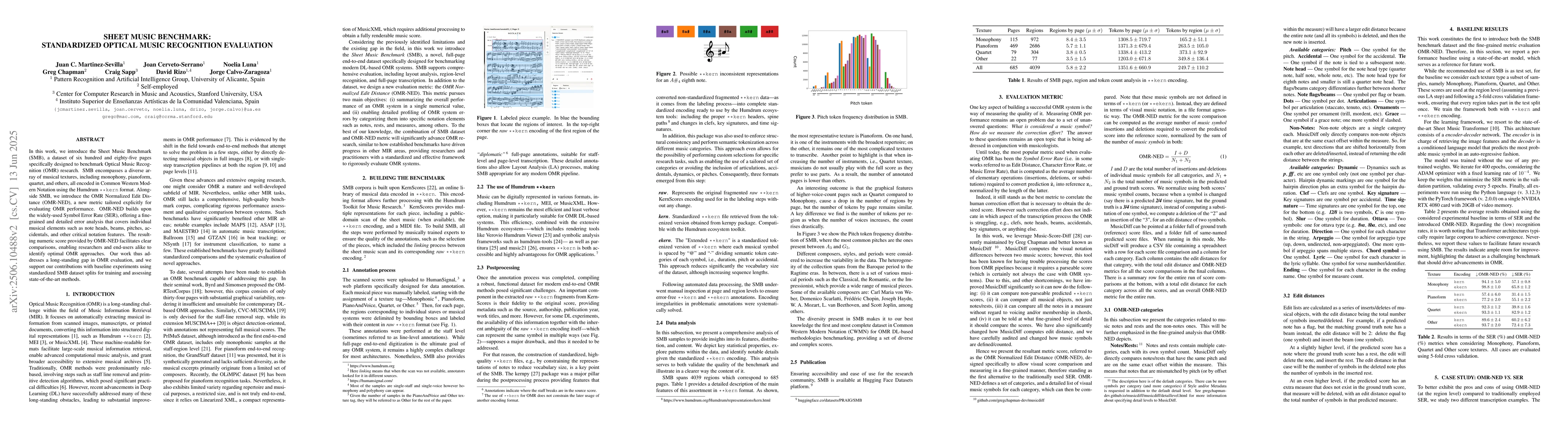 A new dataset called Sheet Music Benchmark (SMB) is introduced to evaluate Optical Music Recognition, offering a diverse range of musical textures and a new metric for error analysis. This effort aims to address a long-standing gap in OMR evaluation, providing researchers with a standardized framework for comparing different approaches.