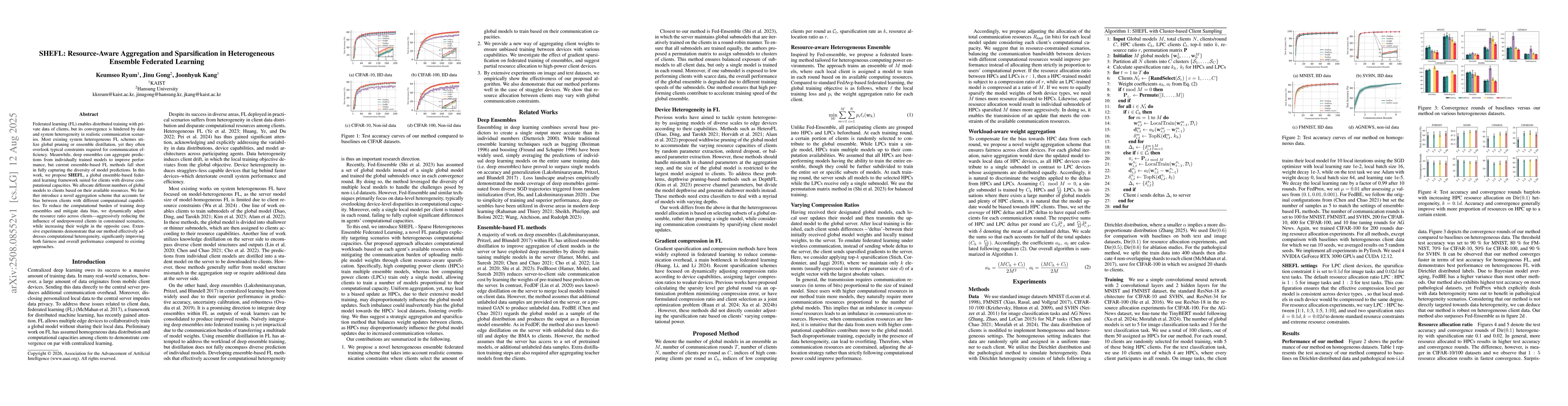Federated learning enables distributed training with private data of clients, but its convergence is hindered by data and system heterogeneity in realistic communication scenarios. Most existing system heterogeneous FL schemes utilize global pruning or ensemble distillation, yet they often overlook typical constraints required for communication efficiency. Meanwhile, deep ensembles can aggregate predictions from individually trained models to improve performance, but current ensemble-based FL methods fall short in fully capturing the diversity of model predictions. In this work, we propose SHEFL, a global ensemble-based federated learning framework suited for clients with diverse computational capacities. We allocate different numbers of global models to clients based on their available resources. We further introduce a novel aggregation scheme that accounts for bias between clients with different computational capabilities. To reduce the computational burden of training deep ensembles and mitigate data bias, we dynamically adjust the resource ratio across clients - aggressively reducing the influence of underpowered clients in constrained scenarios, while increasing their weight in the opposite case. Extensive experiments demonstrate that our method effectively addresses computational heterogeneity, significantly improving both fairness and overall performance compared to existing approaches.