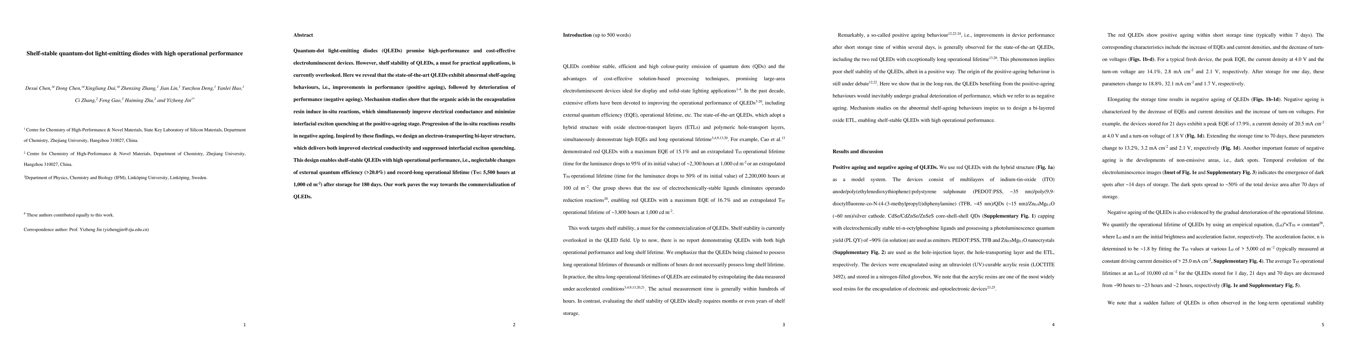 This paper investigates the shelf stability of quantum-dot light-emitting diodes (QLEDs), revealing unexpected positive and negative ageing behaviours. The authors propose a bi-layer electron-transporting structure to enhance stability, resulting in QLEDs with high operational performance and ultra-long operational lifetimes.