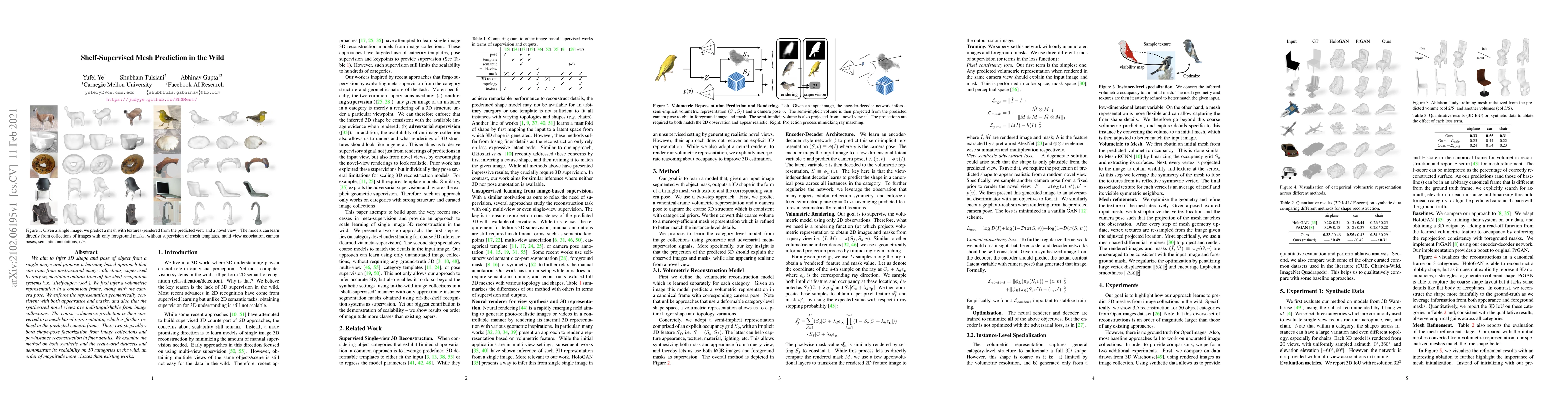 We aim to infer 3D shape and pose of object from a single image and propose a learning-based approach that can train from unstructured image collections, supervised by only segmentation outputs from off-the-shelf recognition systems (i.e. 'shelf-supervised'). We first infer a volumetric representation in a canonical frame, along with the camera pose. We enforce the representation geometrically consistent with both appearance and masks, and also that the synthesized novel views are indistinguishable from image collections. The coarse volumetric prediction is then converted to a mesh-based representation, which is further refined in the predicted camera frame. These two steps allow both shape-pose factorization from image collections and per-instance reconstruction in finer details. We examine the method on both synthetic and real-world datasets and demonstrate its scalability on 50 categories in the wild, an order of magnitude more classes than existing works.