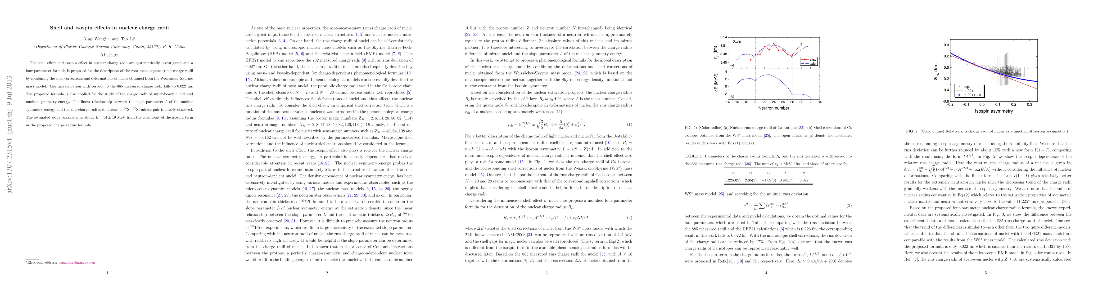 This paper investigates shell and isospin effects on nuclear charge radii, proposing a four-parameter formula that combines shell corrections and deformations from the Weizsäcker-Skyrme mass model, achieving a rms deviation of 0.022 fm. It also explores the relationship between nuclear symmetry energy and charge radii, estimating the slope parameter L to be $L=54 \pm 19$ MeV.