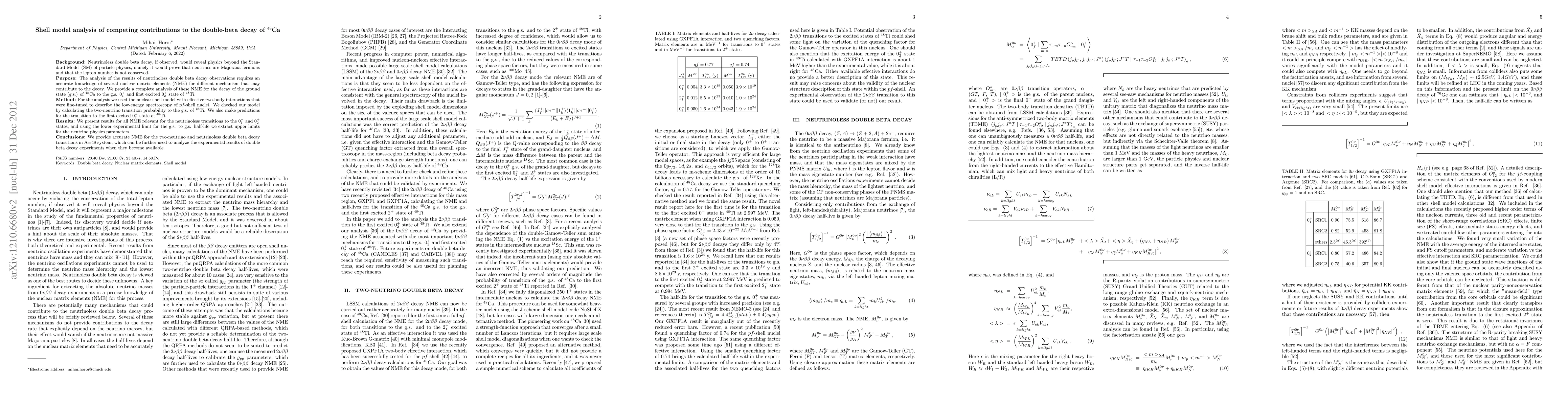 This paper uses the shell model to analyze nuclear matrix elements for the double-beta decay of $^{48}$Ca, providing accurate predictions for both two-neutrino and neutrinoless decay mechanisms, and setting upper limits for neutrino physics parameters based on current experimental data.