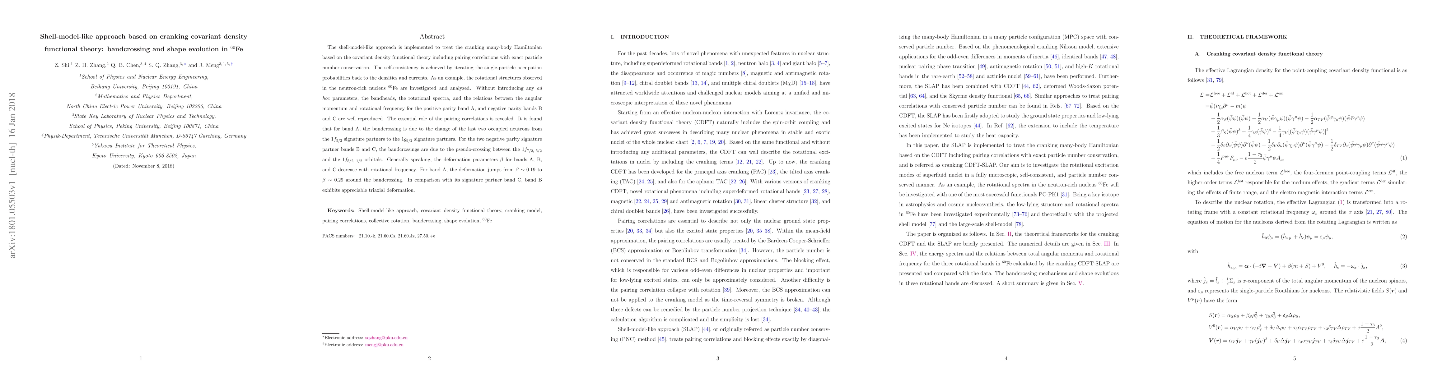 The shell-model-like approach is implemented to treat the cranking many-body Hamiltonian based on the covariant density functional theory including pairing correlations with exact particle number conservation. The self-consistency is achieved by iterating the single-particle occupation probabilities back to the densities and currents. As an example, the rotational structures observed in the neutron-rich nucleus $^{60}$Fe are investigated and analyzed. Without introducing any \emph{ad hoc} parameters, the bandheads, the rotational spectra, and the relations between the angular momentum and rotational frequency for the positive parity band A, and negative parity bands B and C are well reproduced. The essential role of the pairing correlations is revealed. It is found that for band A, the bandcrossing is due to the change of the last two occupied neutrons from the $1f_{5/2}$ signature partners to the $1g_{9/2}$ signature partners. For the two negative parity signature partner bands B and C, the bandcrossings are due to the pseudo-crossing between the $1f_{7/2,~5/2}$ and the $1f_{5/2,~1/2}$ orbitals. Generally speaking, the deformation parameters $\beta$ for bands A, B, and C decrease with rotational frequency. For band A, the deformation jumps from $\beta\sim0.19$ to $\beta\sim0.29$ around the bandcrossing. In comparison with its signature partner band C, band B exhibits appreciable triaxial deformation.