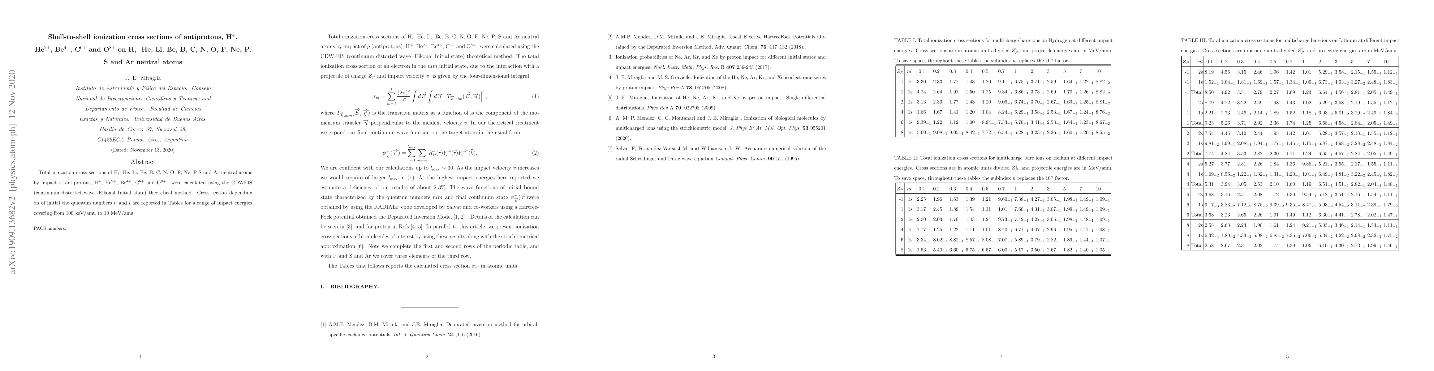 Total ionization cross sections of H, He, Li, Be, B, C, N, O, F, Ne, P, S and Ar neutral atoms by impact of antiprotons, H^{+}, He^{2+}, Be^{4+}, % C^{6+} and O^{8+}. were calculated using the CDWEIS (continuum distorted wave -Eikonal Initial state) theoretical method. Cross section depending on of initial the quantum numbers n and l are reported in Tables for a range of impact energies covering from 100 keV/amu to 10 MeV/amu