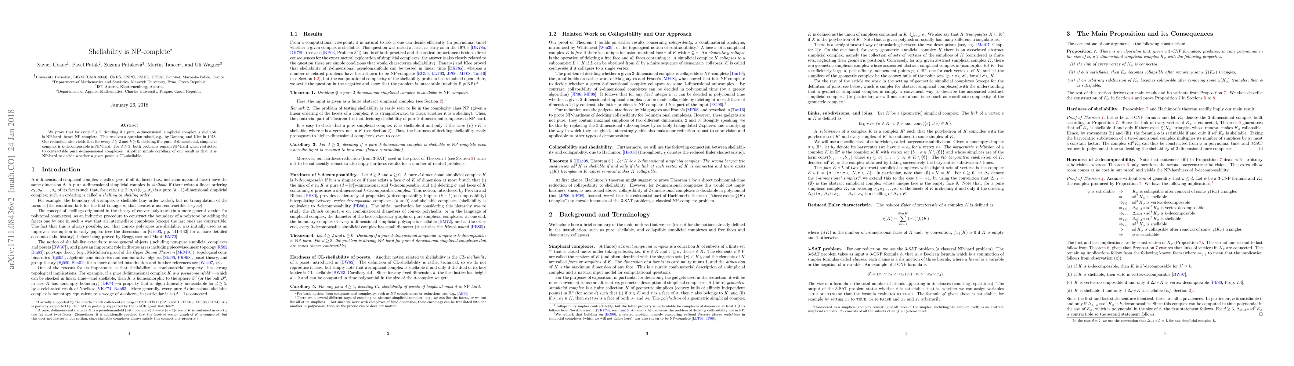 The paper demonstrates that determining whether a pure $d$-dimensional simplicial complex is shellable or $k$-decomposable is NP-complete for $d\geq 2$. This resolves a longstanding question and shows that these problems remain NP-hard even when restricted to contractible complexes for $d \ge 3$.