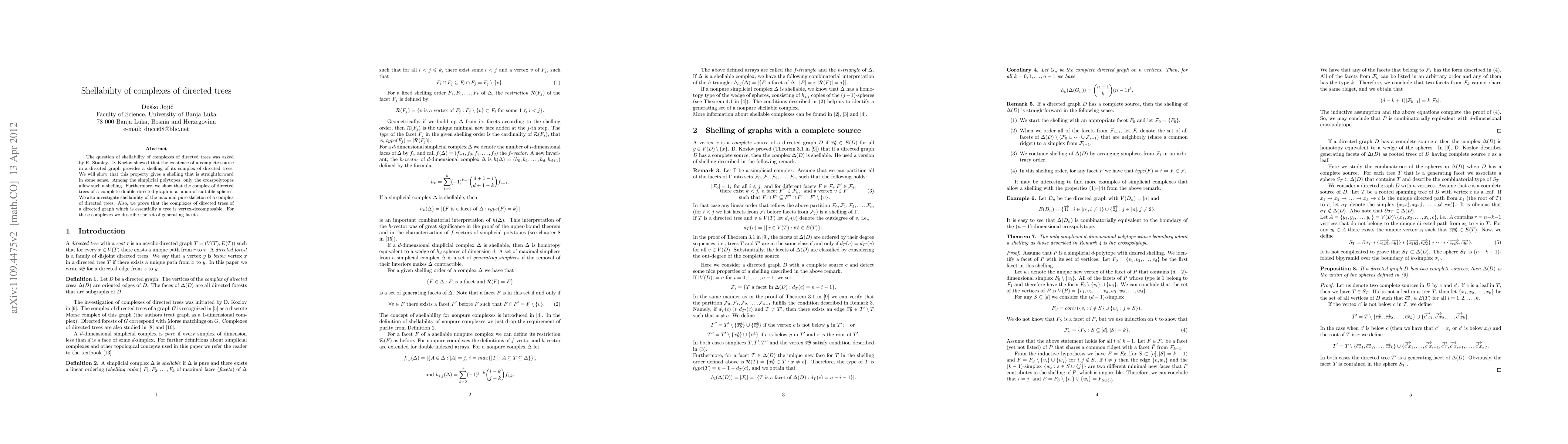 This paper investigates the shellability of complexes formed by directed trees, demonstrating that the presence of a complete source in a directed graph leads to a straightforward shelling. It concludes that only crosspolytopes among simplicial polytopes exhibit such a shelling and explores the structure of complexes derived from complete double directed graphs.