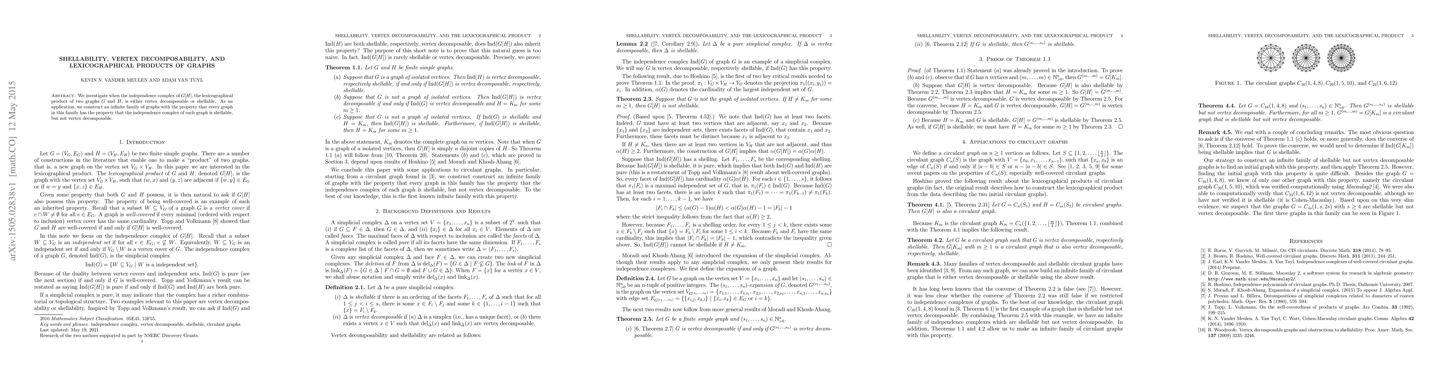 Researchers investigated shellability and vertex decomposability of graph independence complexes, finding an infinite family of graphs with shellable but not vertex decomposable independence complexes.