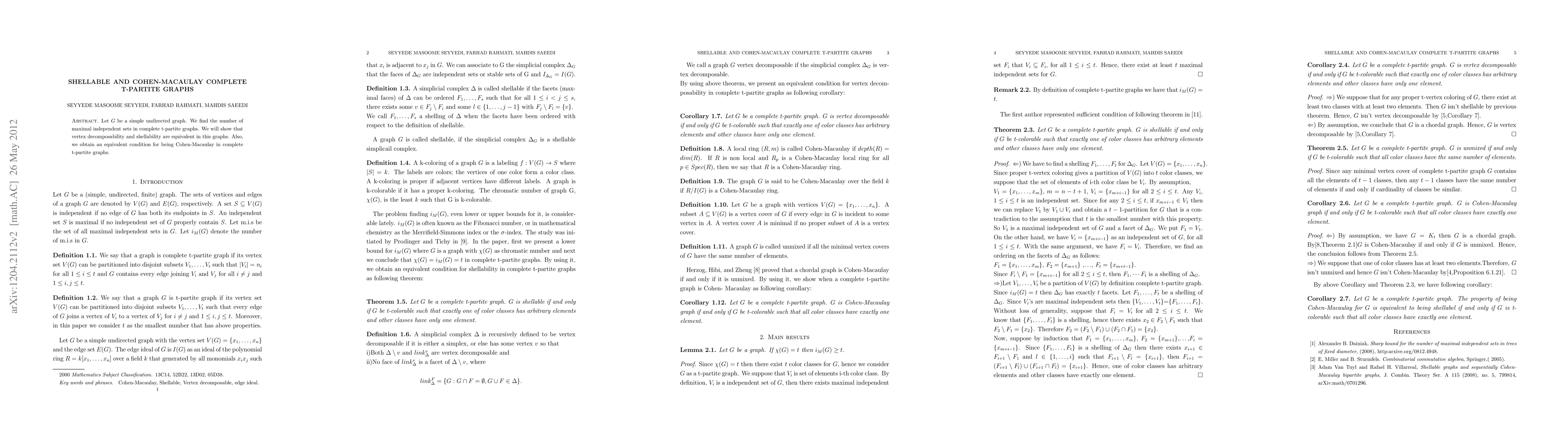 This research paper explores properties of complete t-partite graphs, finding that shellability is equivalent to vertex decomposability and that these conditions also imply being Cohen-Macaulay.