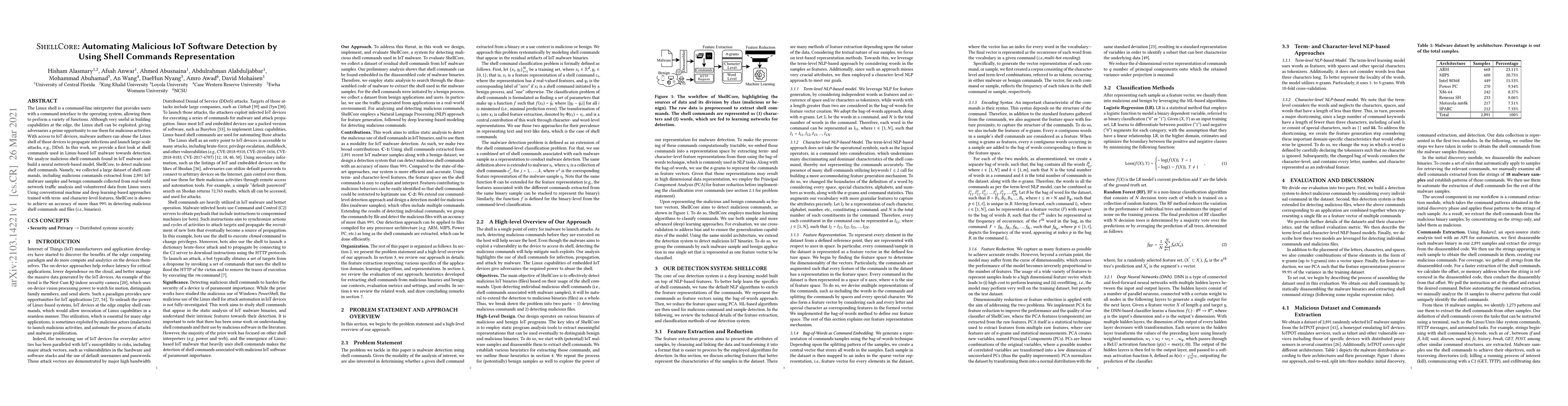 ShellCore automates the detection of malicious IoT software by representing shell commands and employing a neural network model to identify harmful commands with over 99% accuracy, distinguishing them from benign commands sourced from real-world network traffic and user data.