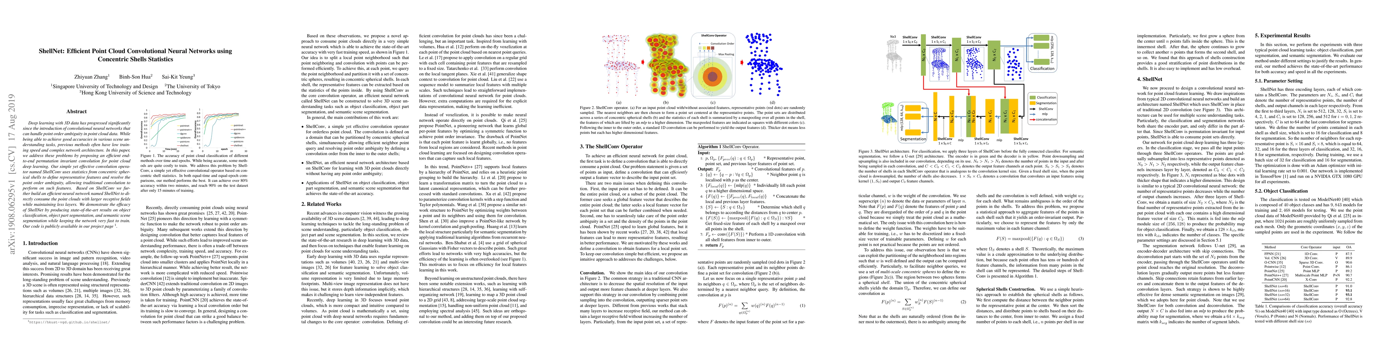 ShellNet proposes an efficient ShellConv operator for point cloud deep learning, using concentric shell statistics to define features and resolve order ambiguity. ShellNet achieves state-of-the-art results on various tasks while maintaining a fast training speed and simpler network architecture.
