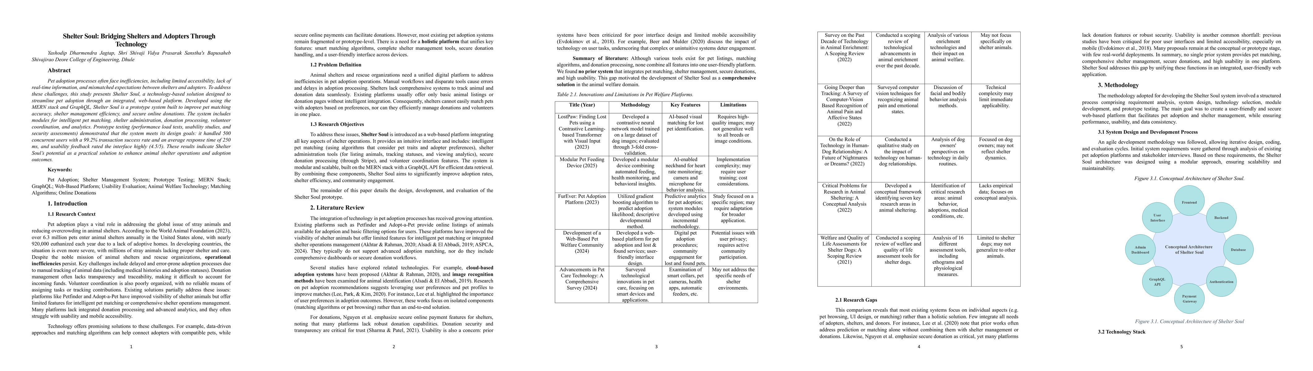 Pet adoption processes often face inefficiencies, including limited accessibility, lack of real-time information, and mismatched expectations between shelters and adopters. To address these challenges, this study presents Shelter Soul, a technology-based solution designed to streamline pet adoption through an integrated, web-based platform. Developed using the MERN stack and GraphQL, Shelter Soul is a prototype system built to improve pet matching accuracy, shelter management efficiency, and secure online donations. The system includes modules for intelligent pet matching, shelter administration, donation processing, volunteer coordination, and analytics. Prototype testing (performance load tests, usability studies, and security assessments) demonstrated that the system meets its design goals: it handled 500 concurrent users with a 99.2% transaction success rate and an average response time of 250 ms, and usability feedback rated the interface highly (4.5/5). These results indicate Shelter Soul's potential as a practical solution to enhance animal shelter operations and adoption outcomes.