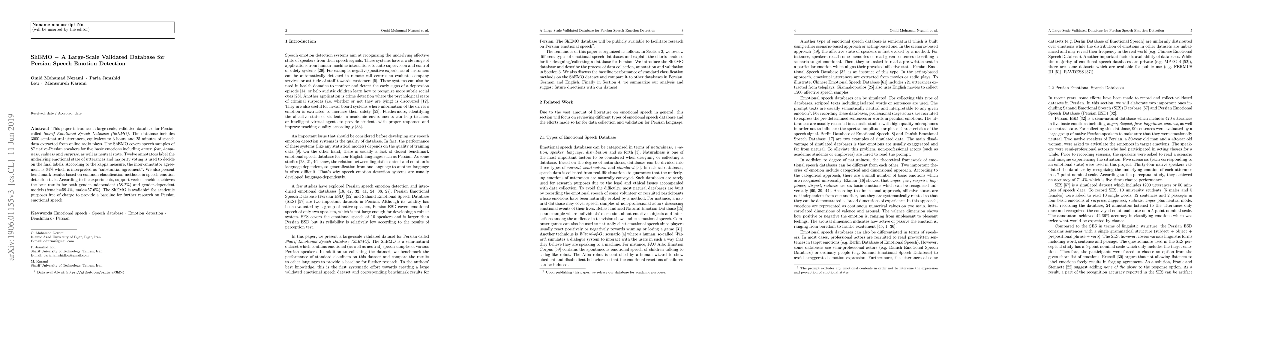 This paper presents ShEMO, a large-scale validated Persian speech emotion database with 3000 utterances from 87 speakers, labeled for six emotional states. Support vector machine achieves the best results in emotion detection, with 58.2% accuracy for gender-independent models.