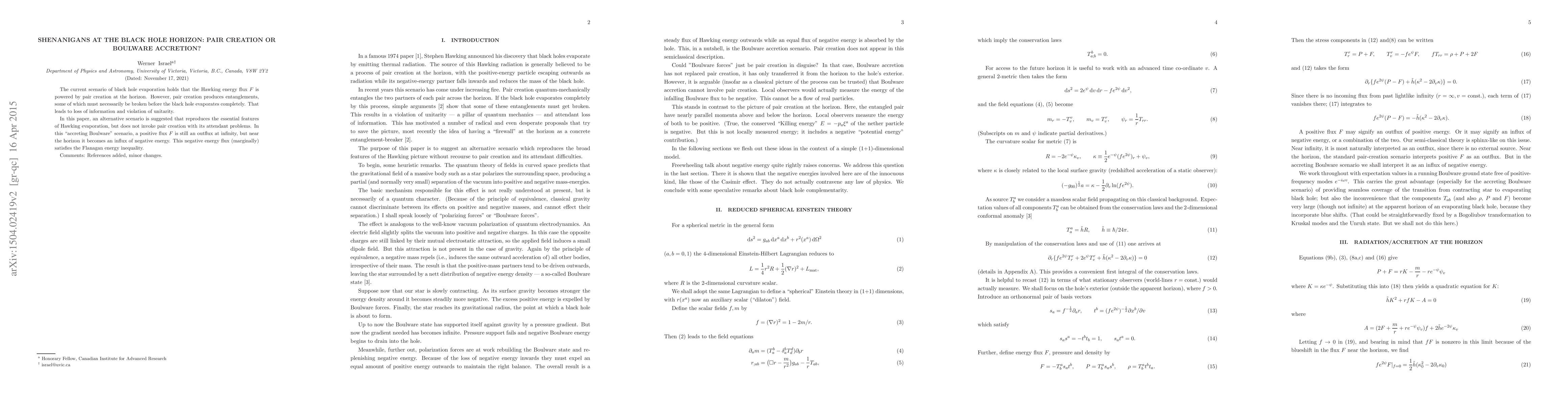 This paper proposes an alternative to Hawking's pair creation mechanism for black hole evaporation, suggesting that instead, negative energy can accrete from the Boulware vacuum state, avoiding information loss and unitarity violations. This "accreting Boulware" scenario maintains the essential features of evaporation without the entanglement issues associated with pair creation.