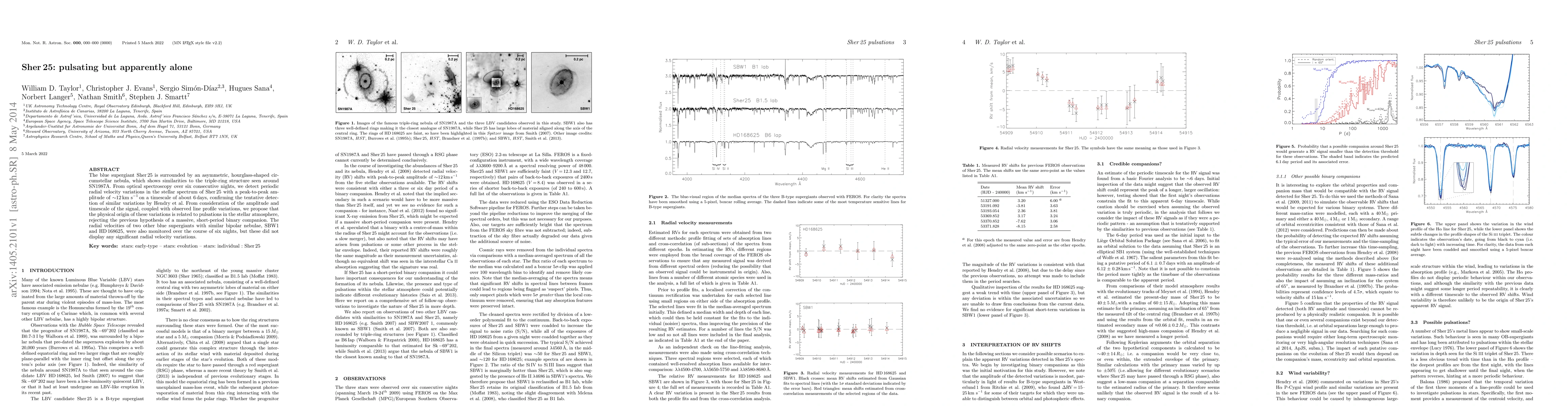 The blue supergiant Sher25 exhibits periodic radial velocity variations, likely due to pulsations, rather than a binary companion, as evidenced by optical spectroscopy over six nights. Unlike Sher25, two other blue supergiants with similar nebulae did not show significant radial velocity variations.